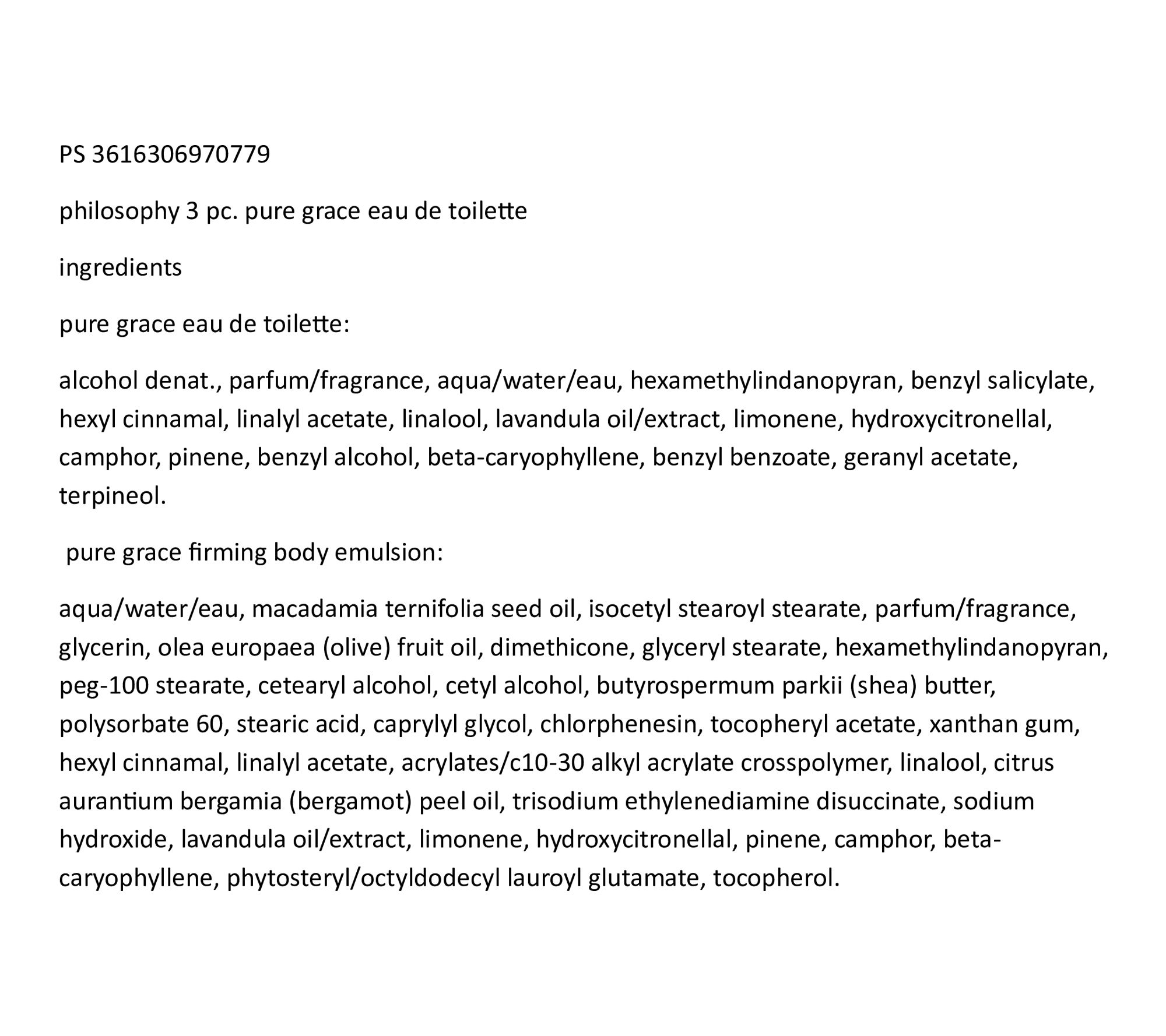 How do I use it: Massage the body emulsion body lotion onto skin. Finish by spritzing with pure grace eau de toilette.
