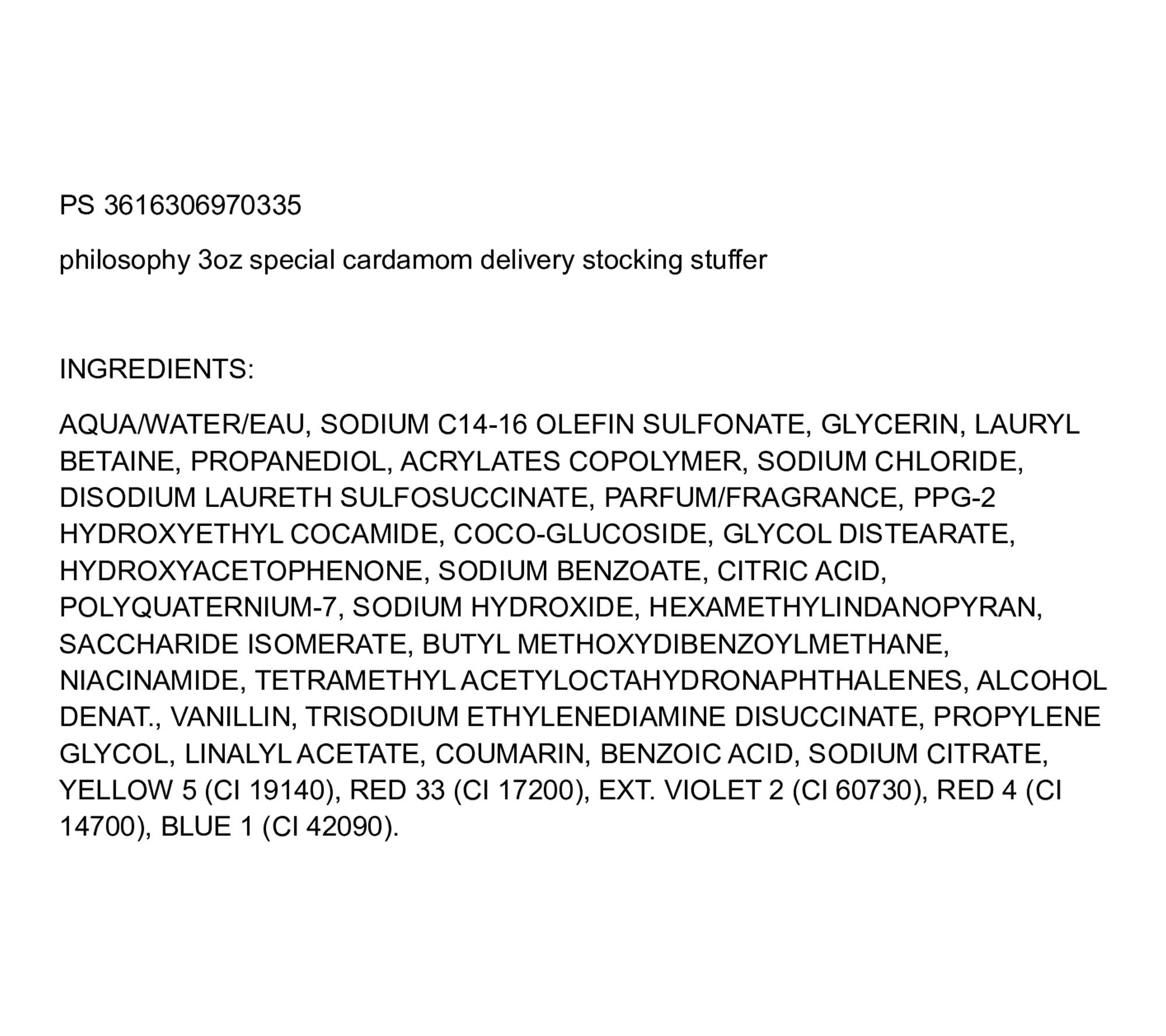 Giftable cheer comes once a year. 'Tis the season for sharing a special delivery with our magical philosophy special-edition 3-oz special cardamom delivery hydrating shower gel, bubble bath, & shampoo stocking stuffer. Let the joyful body care begin with a velvety comforting scent hugged in toasted vanilla and creamy almond milk. Hydrating shower gel helps to provide moisture.