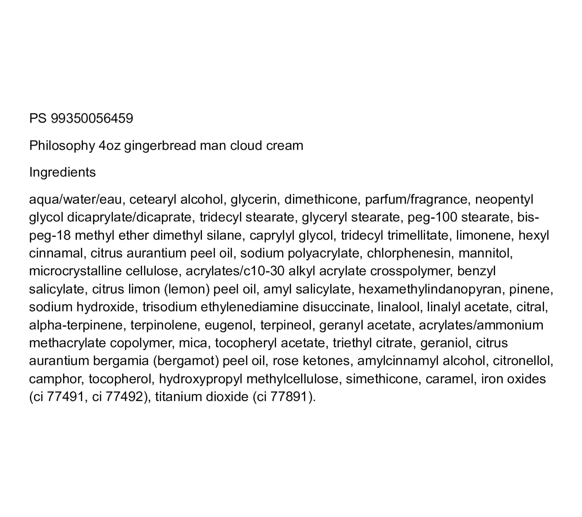 The super-size edition of philosophy's hydrating body cloud cream has a cloud-like texture in a lightweight formula. It combines multiple ingredients to provide hydration. Let the joy begin and smile with surprise at the spicy scent of fresh ginger, fizzy lime, and warm clove.