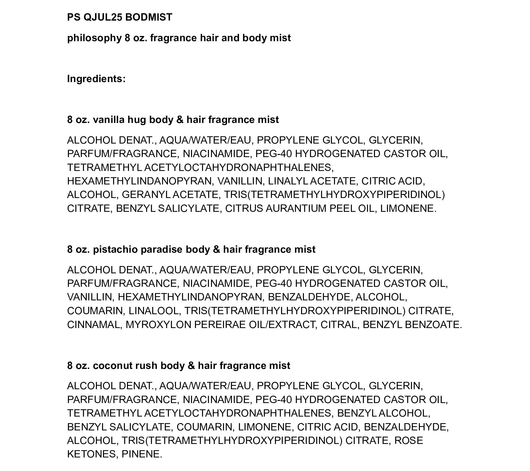 How do I use it: Spray this philosophy body mist onto clean, dry hair and skin. avoid direct eye contact.