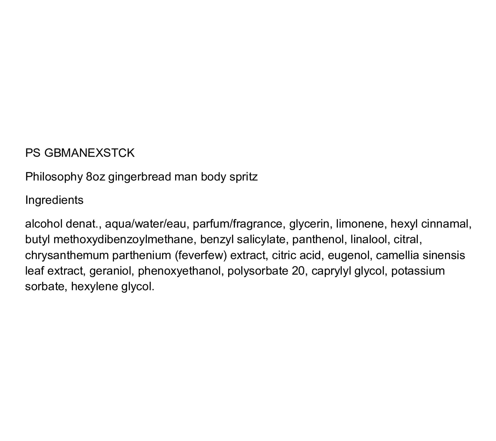 Take a moment to indulge in the comforting, sweet scent of freshly baked gingerbread cookies -- without ever stepping into the kitchen. The philosophy gingerbread man body spritz is a lightweight, refreshing spray designed to uplift your senses and leave you feeling as delightful as a holiday treat.