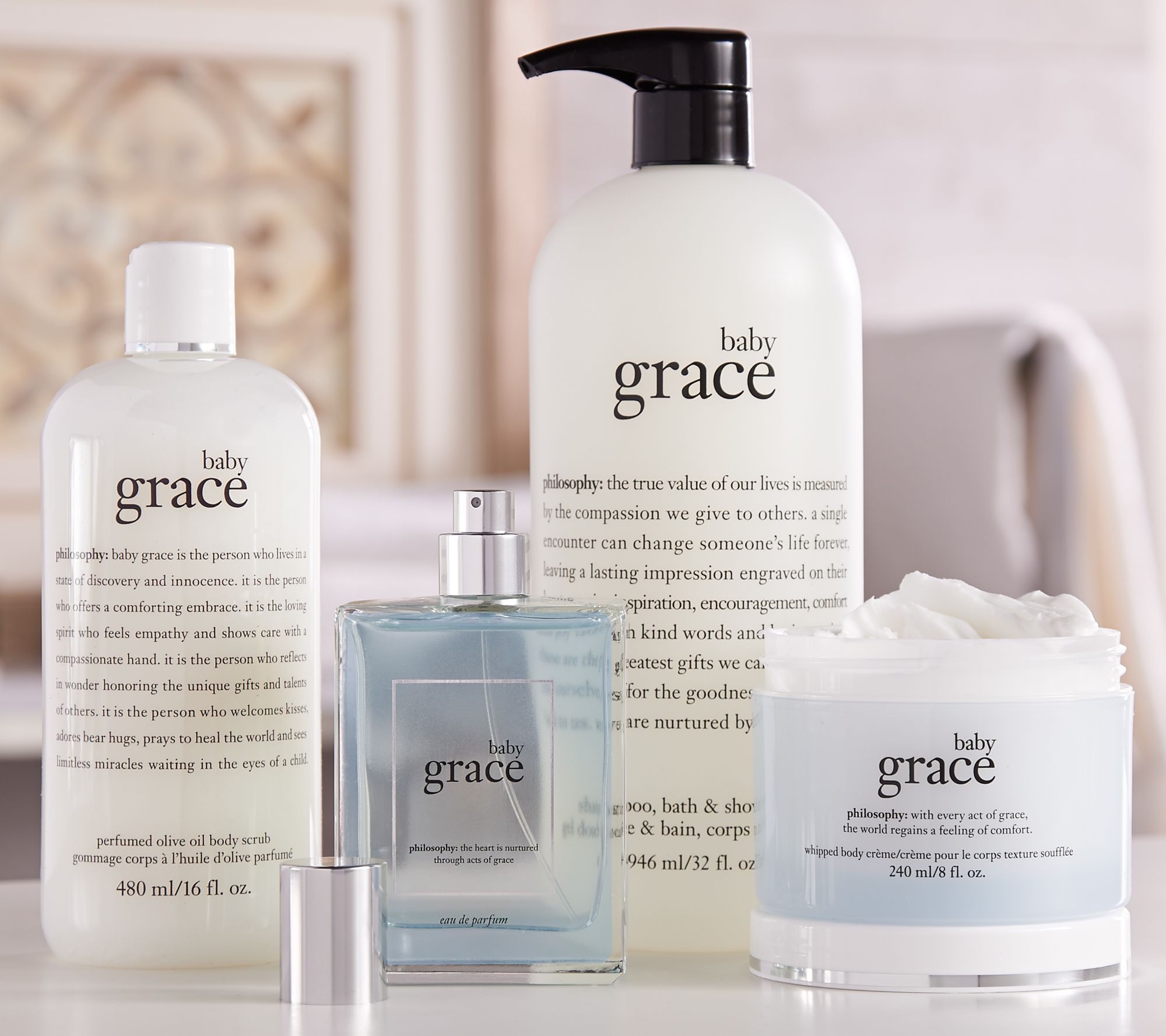 Achieve velvety soft, beautifully scented skin with philosophy's four-piece baby grace kit. To wrap in the softly sweet scent of baby grace, start with the 3-in-1 shower gel and olive oil body scrub to cleanse and smooth away dull, dry skin. The whipped body creme is perfect for added hydration after exfoliation. Made with shea butter and oils, the luxurious formula conditions and helps hydrate, while leaving skin lightly scented with your favorite fragrance. Spritz the eau de parfum fragrance any time you want to lift your spirits or change your mood.