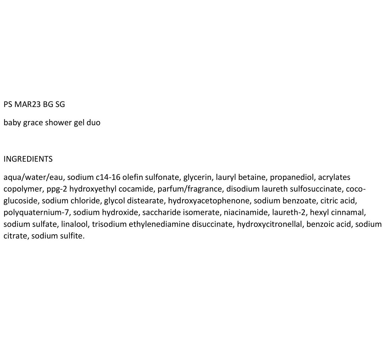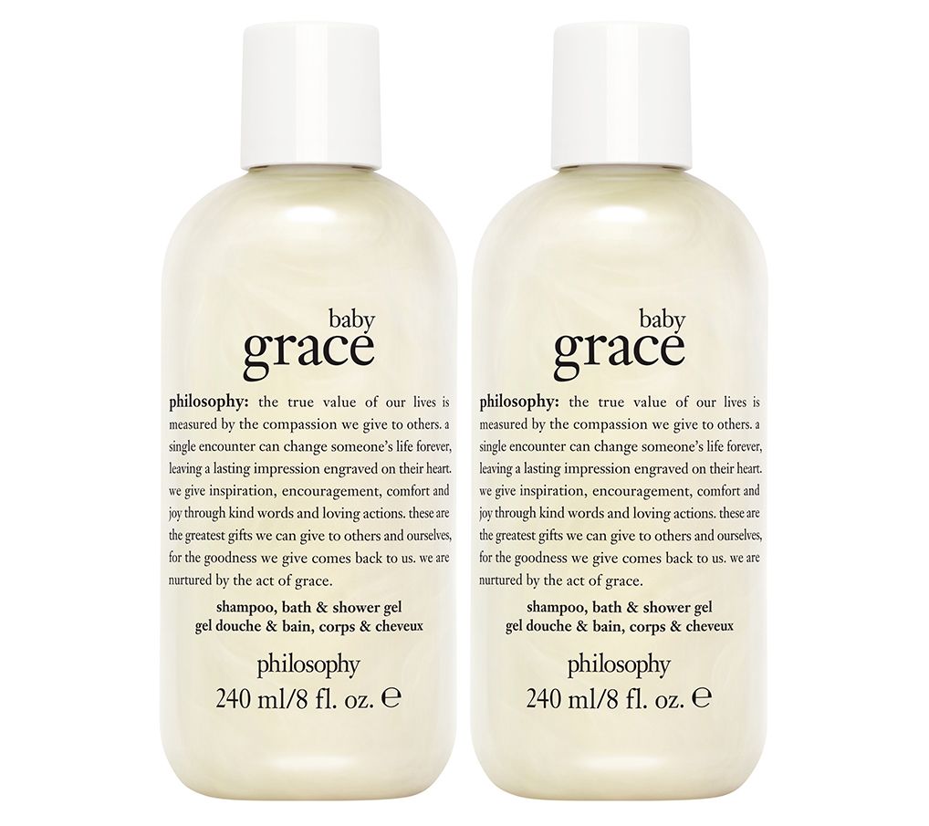 • Two 8-oz shampoo, bath, and shower gels in baby grace