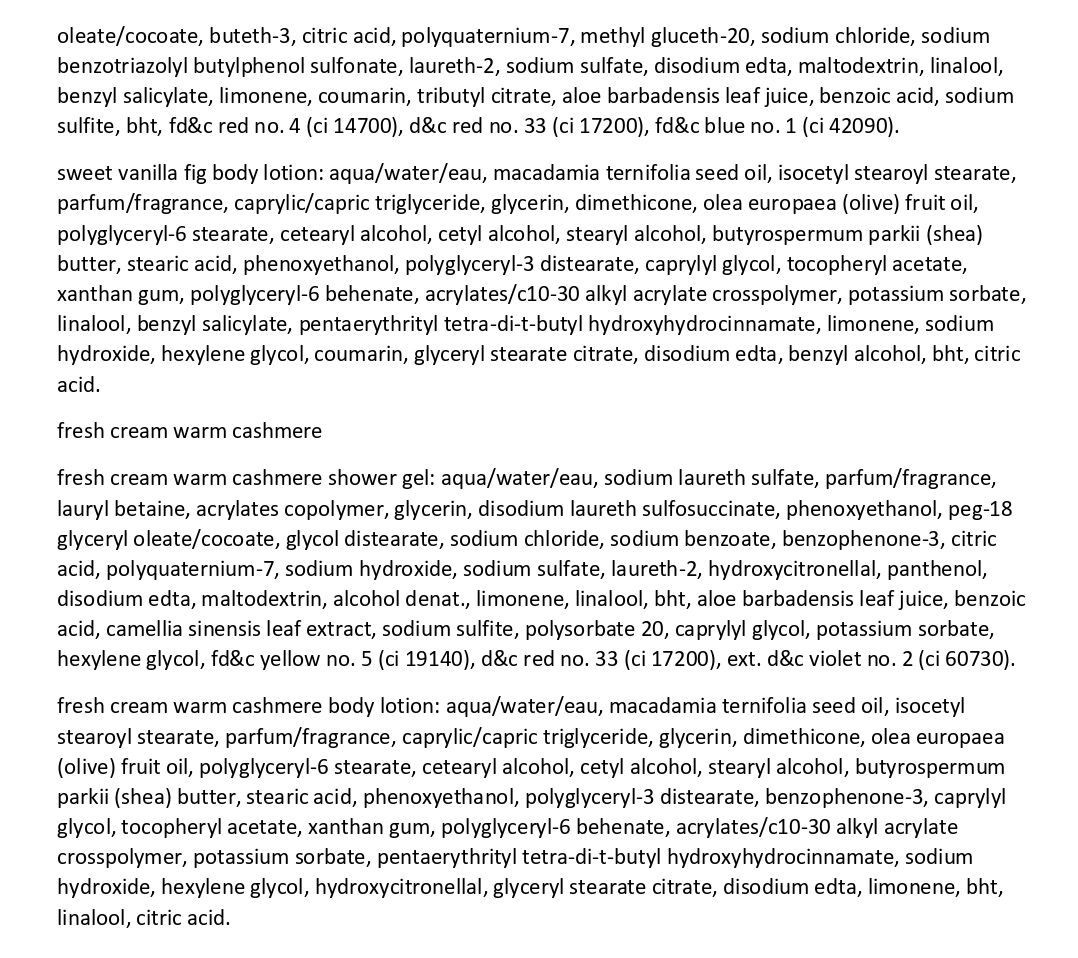 fresh cream warm cashmere is a blend of warm coconut, cashmere wood, vanilla bean, creamy sandalwood, and musk.
