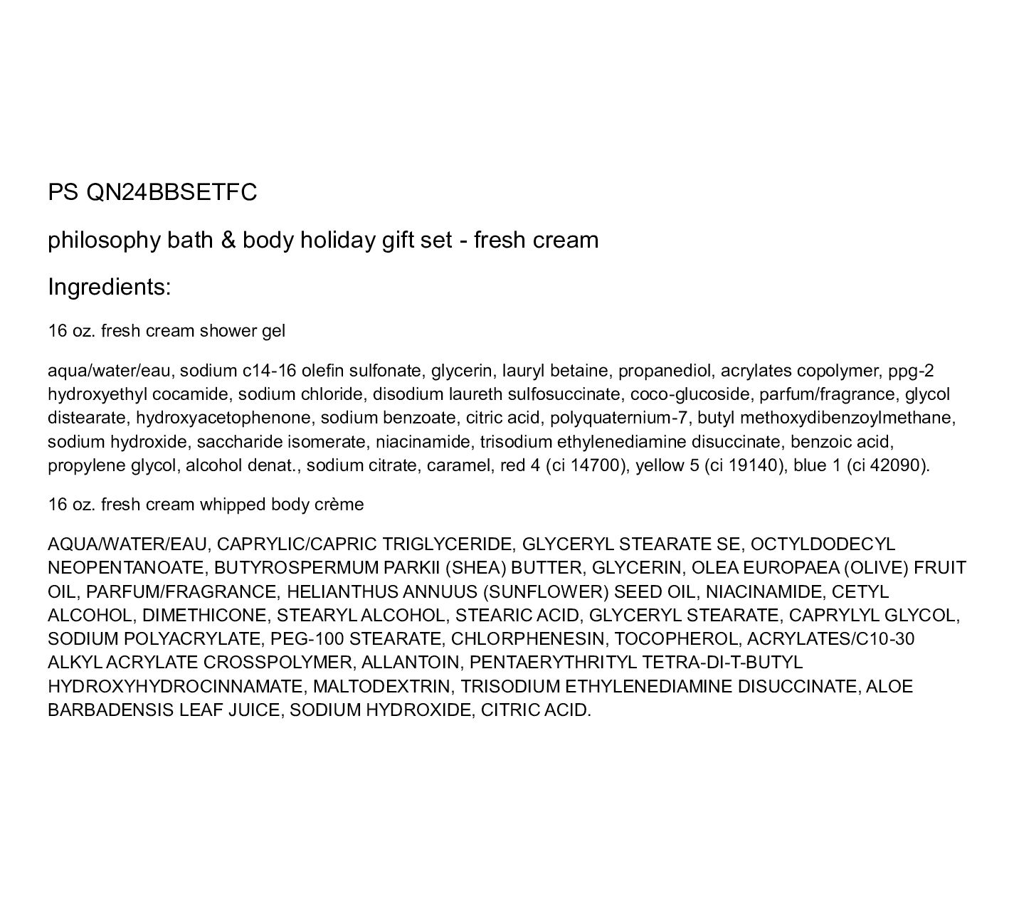 Enjoy sweet clouds of whipped cream folded with tonka and buttercream when you pick up this philosophy fresh cream gift set. The upgraded hydrating and ultra-creamy shower gel keeps the gigantic bubbles everyone loves while cleansing and moisturizing skin. The luxurious whipped body creme formula provides skin with moisture.