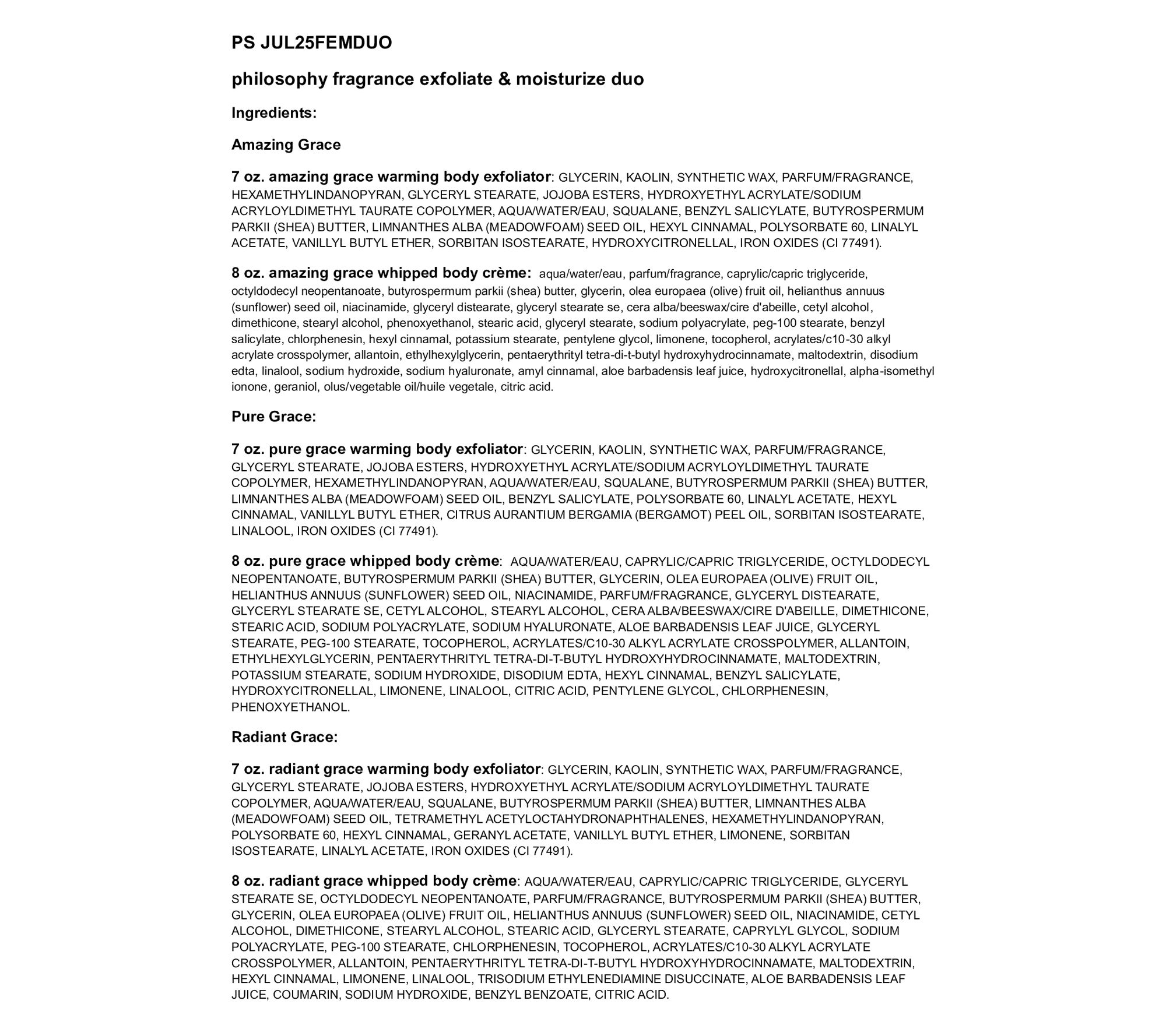 amazing grace: floral blend of bergamot, delicate muguet blossoms and musk pure grace: refreshing mix of water lily, leafy greens, and frosted musk offer a crisp, clean scent radiant grace: black cherry accord, jasmine, caramelized sandalwood