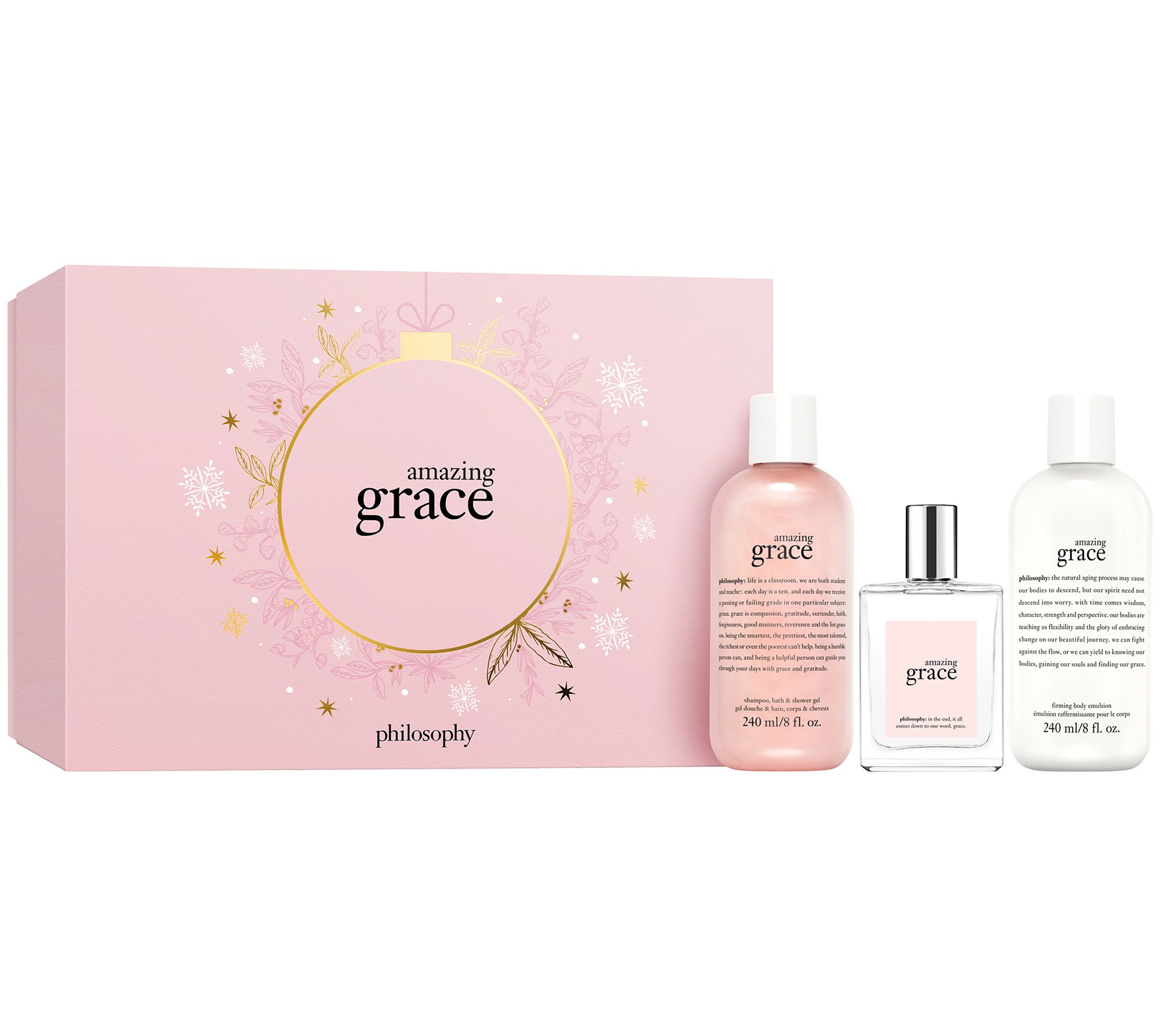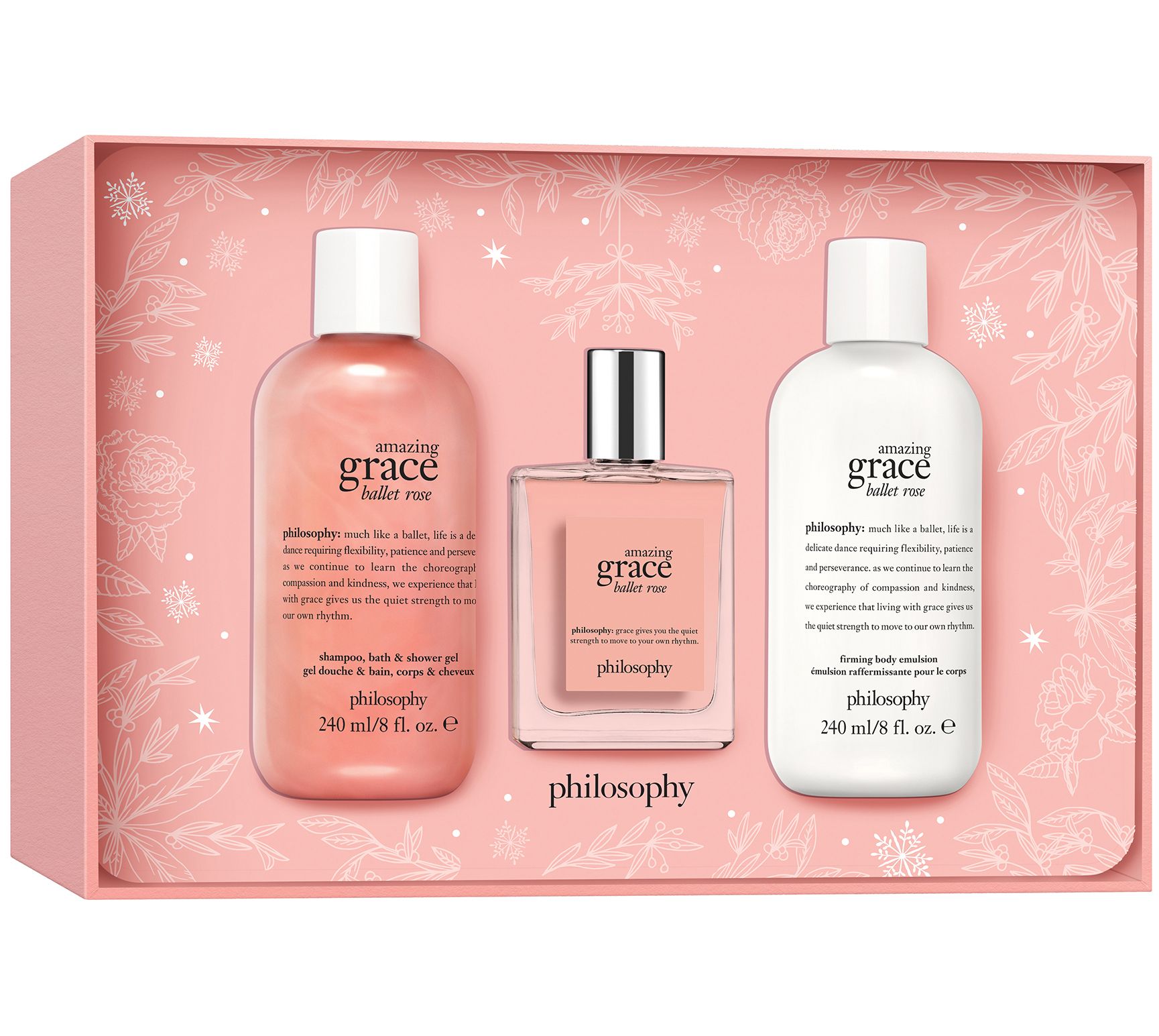 Give the gift of grace this holiday season with philosophy's three-piece fragrance layering gift set wrapped in a beautiful gift box. The experience opens with the shampoo, bath & shower gel, featuring a rich lather that leaves skin and hair clean, soft, and delicately scented.