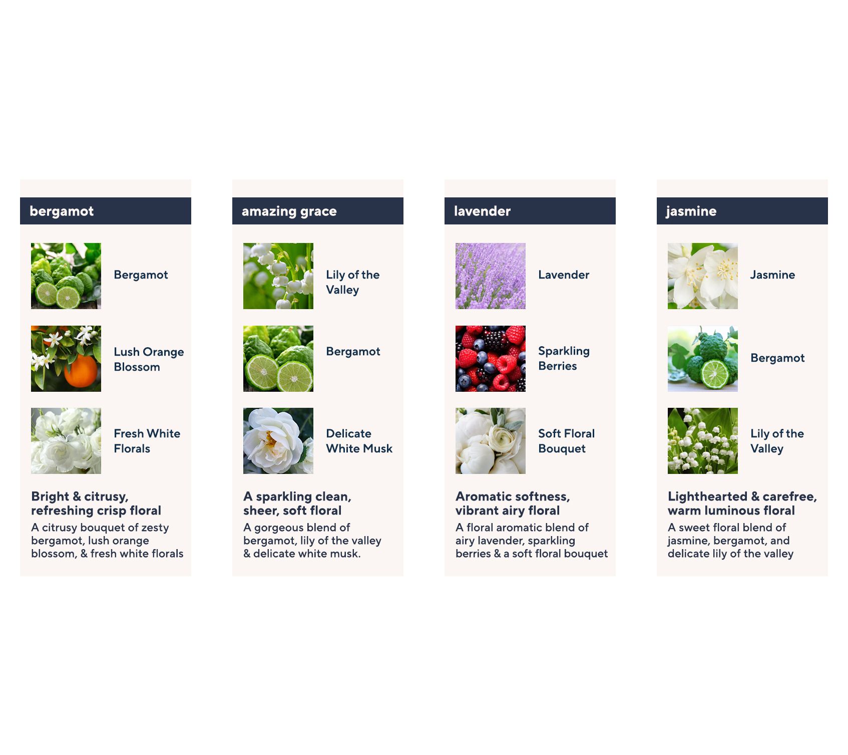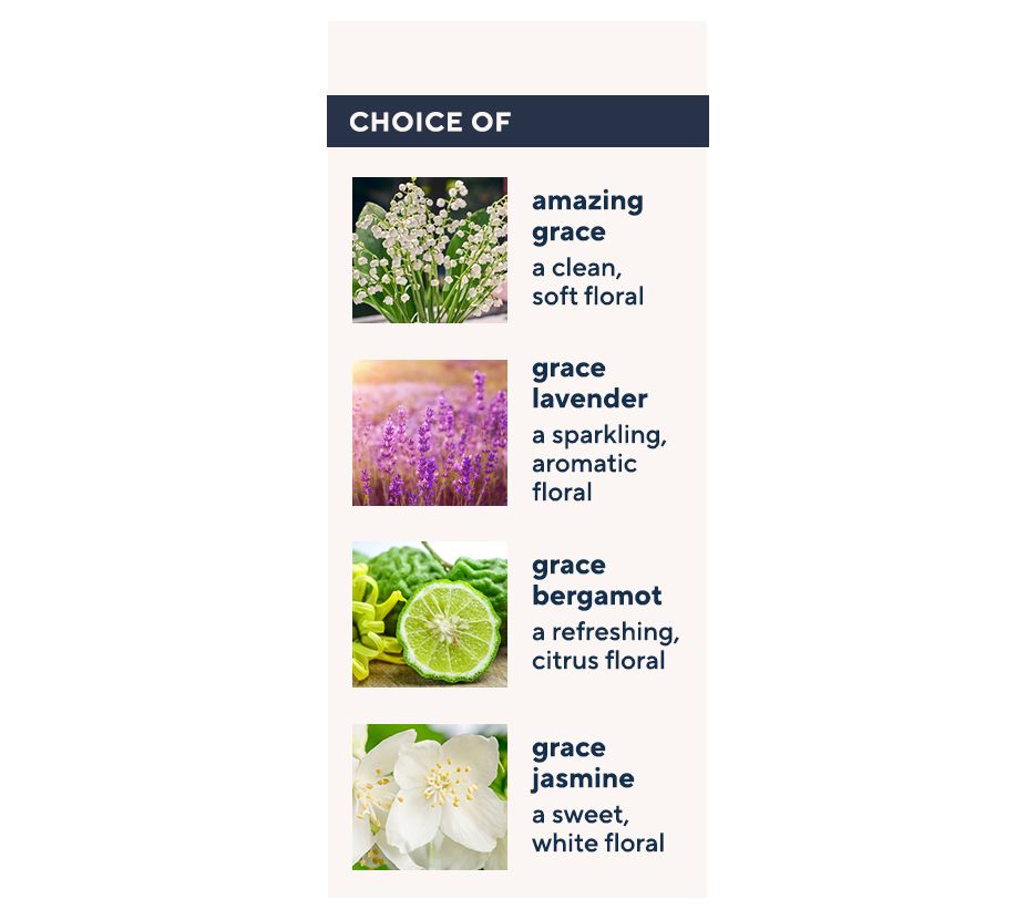 amazing grace: classic, beautifully clean, sparkling floral scent of bergamot, lily of the valley and soft white musk