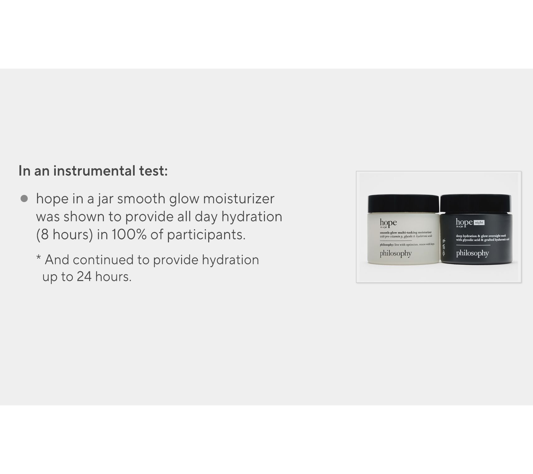 philosophy's hope in a jar multi-tasking moisturizer with pro-vitamin P, glycolic, and hyaluronic acids is formulated for all-day long hydration. The hope in a jar deep hydration and glow overnight mask is formulated with glycolic acid and grafted hyaluronic acid. And thanks to this Auto-Delivery plan, you'll receive a new shipment approximately every six months for one year.