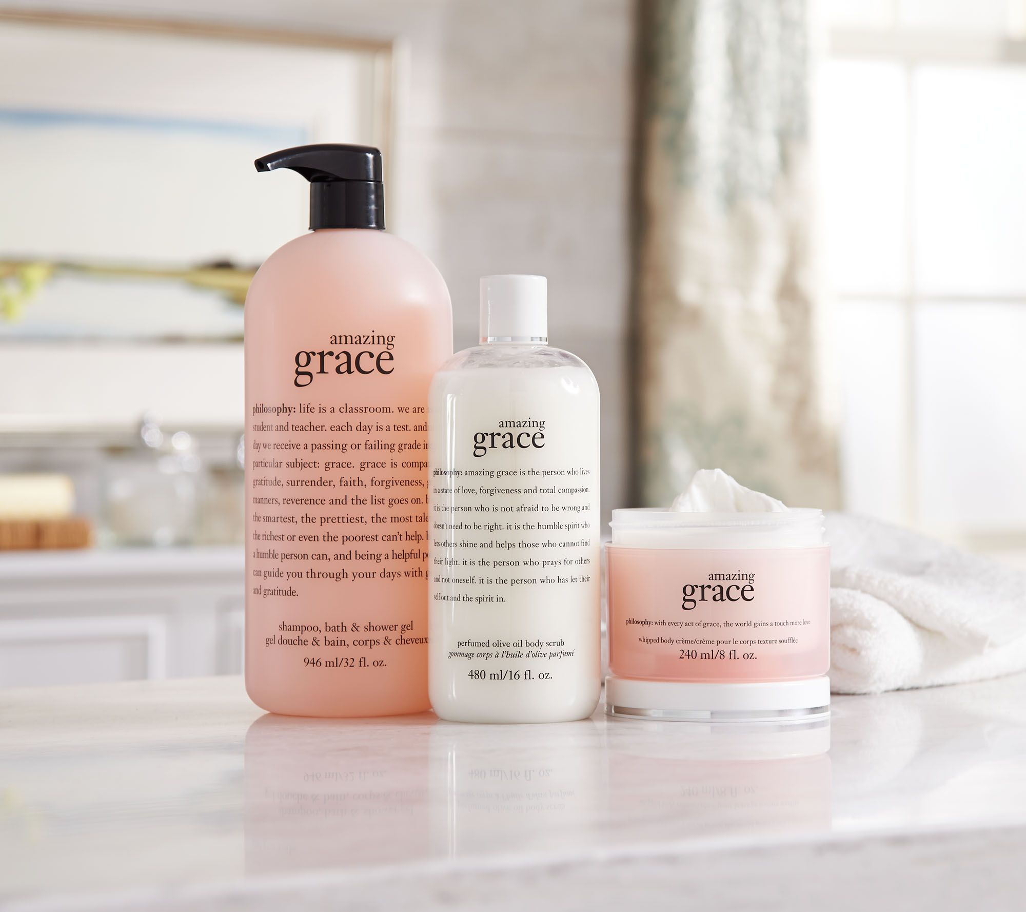 Embrace your signature scent with this three-piece layering collection from philosophy, which includes shampoo, bath, and shower gel; perfumed olive oil body scrub; and whipped body creme.