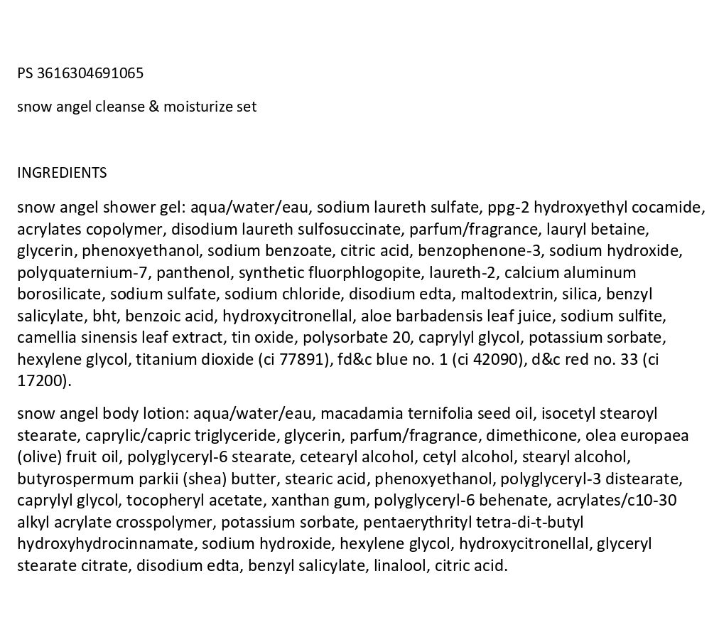 It's the season of sweet wishes carried by indulgent holiday scents floating in the air. So make your list, check it twice, and delight in the homey fragrances of this philosophy holiday gift set that includes snow angel scented shower gel, shampoo, body wash and bubble bath to cleanse and condition from head to toe, and snow angel body lotion to help nourish winter skin.