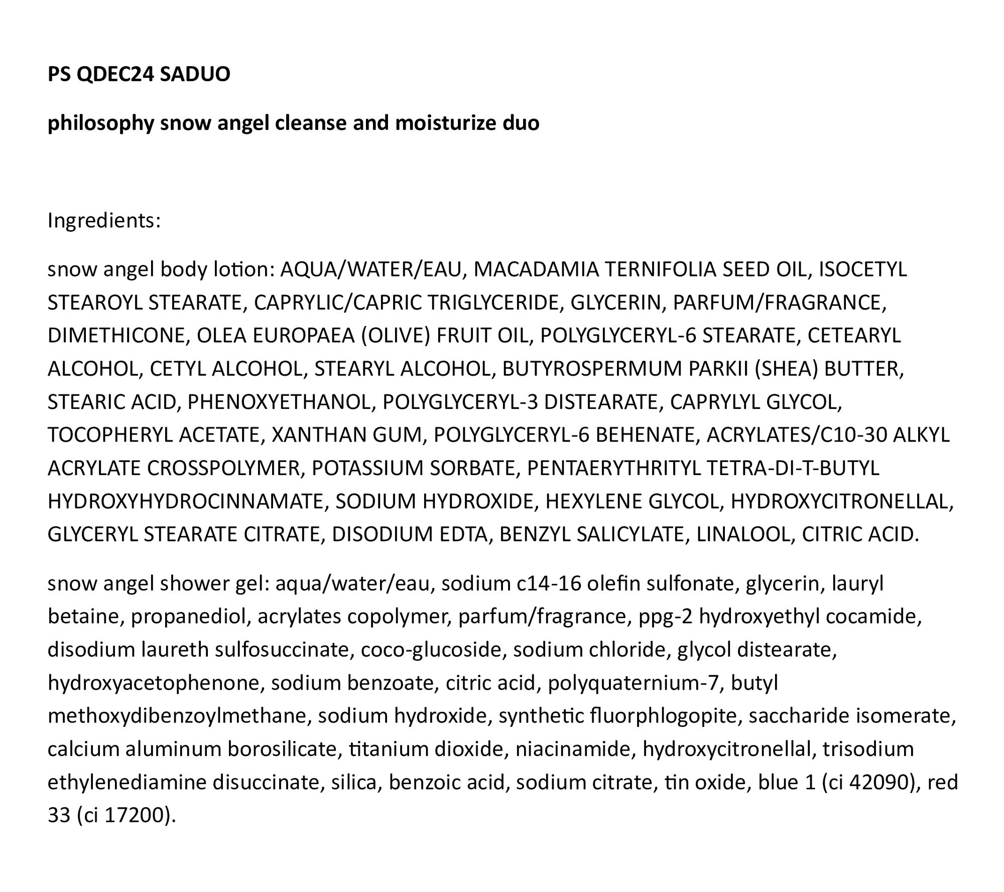 Let the joyful body care begin with the soft and cheerful scented snow angel cleanse and moisturize set. snow angel is scented with crisp Fuji apple, fresh citrus, sugared musk, and soft sandalwood.