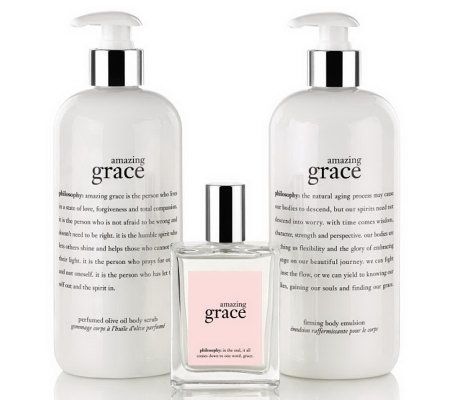 amazing grace: includes 16-fl oz perfumed olive oil body scrub, 16-fl oz firming body emulsion, and 2-fl oz eau de parfum