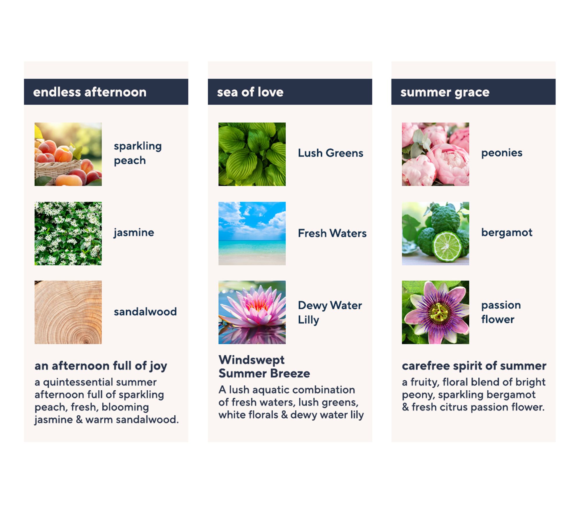 summer grace is a sunny, carefree spirit of summer that refreshes the spirit and opens the heart. The warm, bright floral fragrance of sunkissed bergamot, passion flower, and warm coconut musk was created to make you feel the lighthearted happiness and ease of summer.