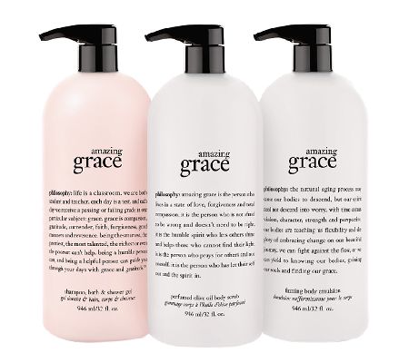 What is it: Experience the best of grace with this ultimate super-sized, fragrance-layering body trio, featuring philosophy's perfumed shampoo, bath, and shower gel; olive oil body scrub; and firming body emulsion or body lotion in your choice of amazing grace, pure grace, or living grace.