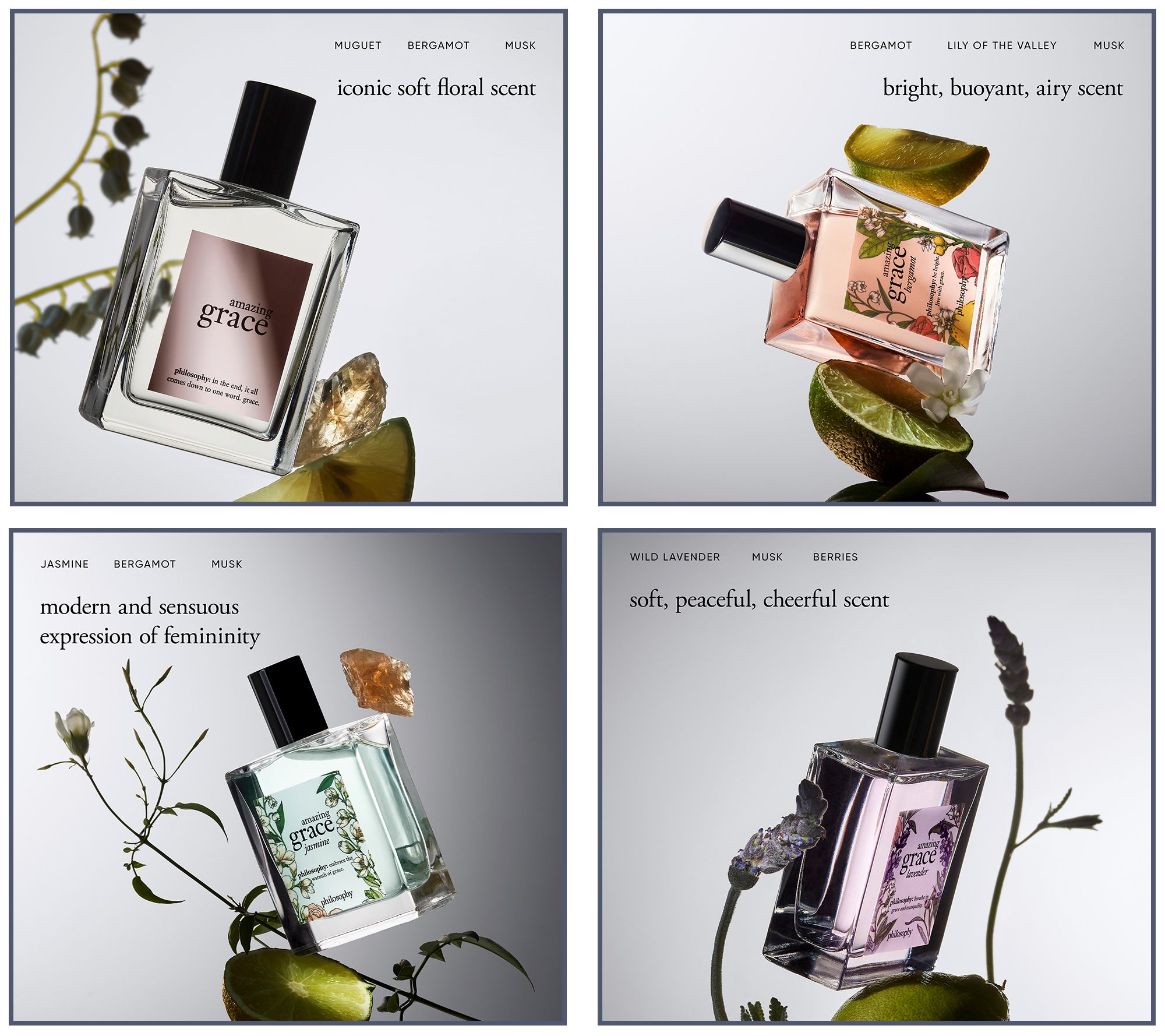 If you prefer fresh and clean notes (such as pure grace), amazing grace bergamot uses luscious bergamot to amplify the timeless softness of the beloved original. Delicate floral orange blossom mingles with muguet to mellow the composition, coming to rest atop graceful warm musk.