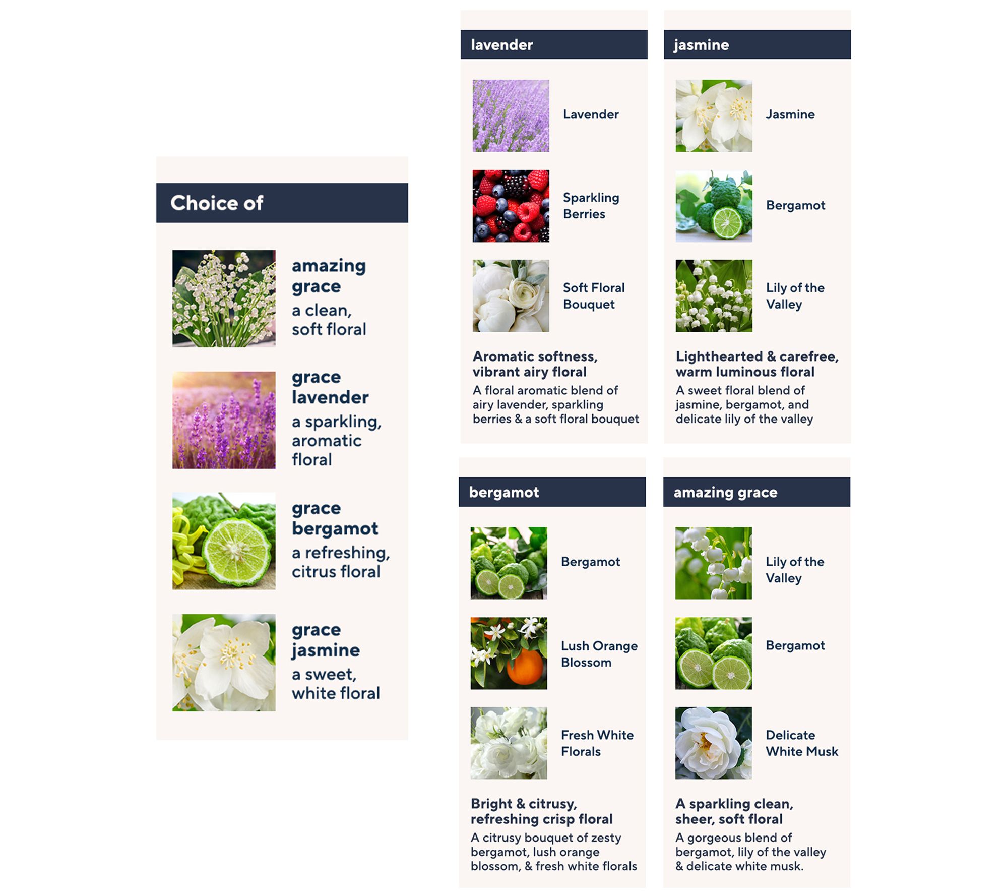 amazing grace is a sparkling floral scent of bergamot, lily of the valley, and soft white musk designed to make you feel amazingly clean and beautifully feminine.