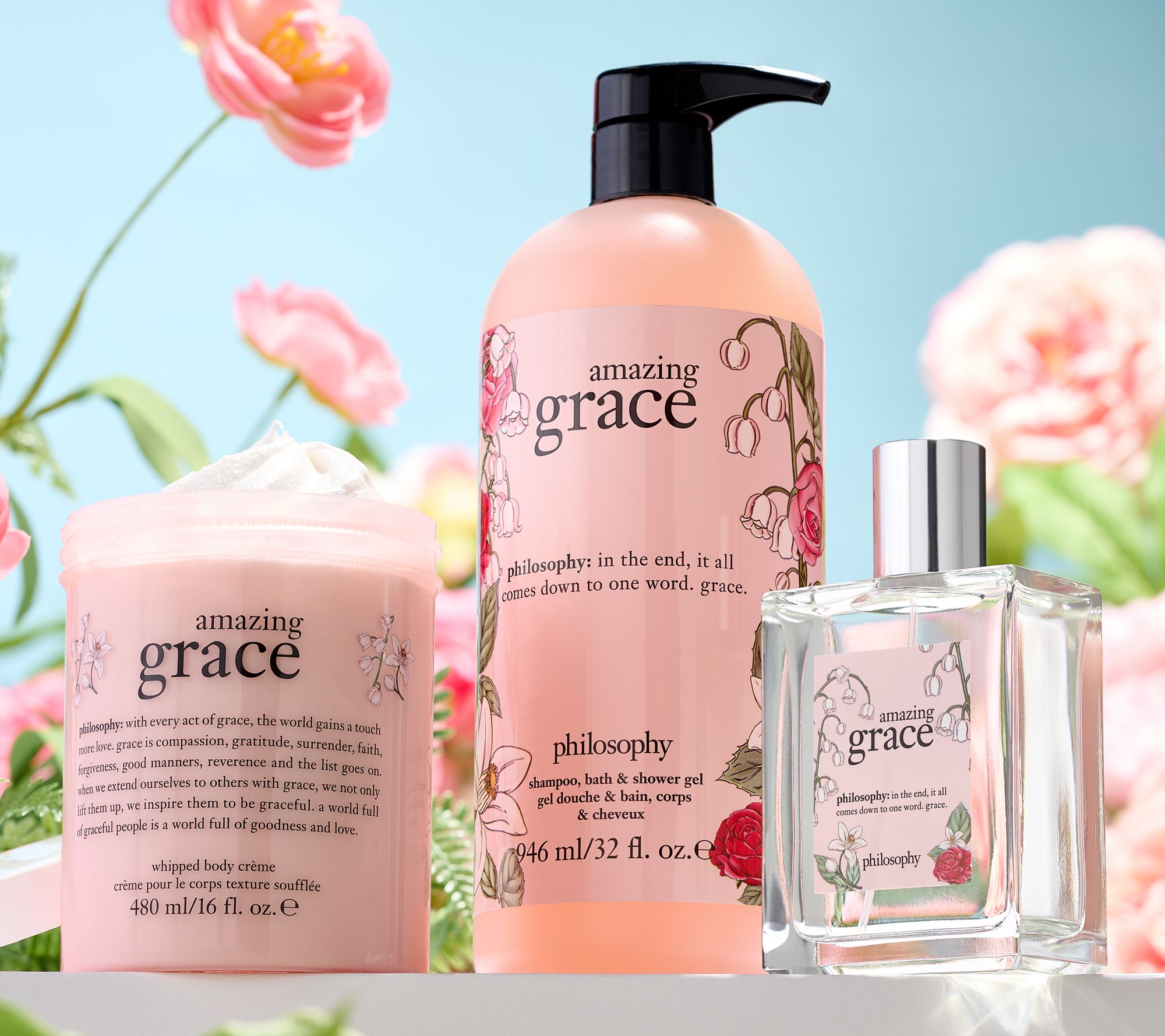 For a beautiful twist on your layering story, fragrance yourself from head to toe with this super-size philosophy collection. Start by cleansing with shampoo, bath, and shower gel, then moisturize with whipped body creme, and finish with a spritz of eau de toilette. And we have a grace for all -- pick up this three-piece set in your choice of classic amazing grace or one of three twists: amazing grace bergamot, amazing grace jasmine, or amazing grace lavender.