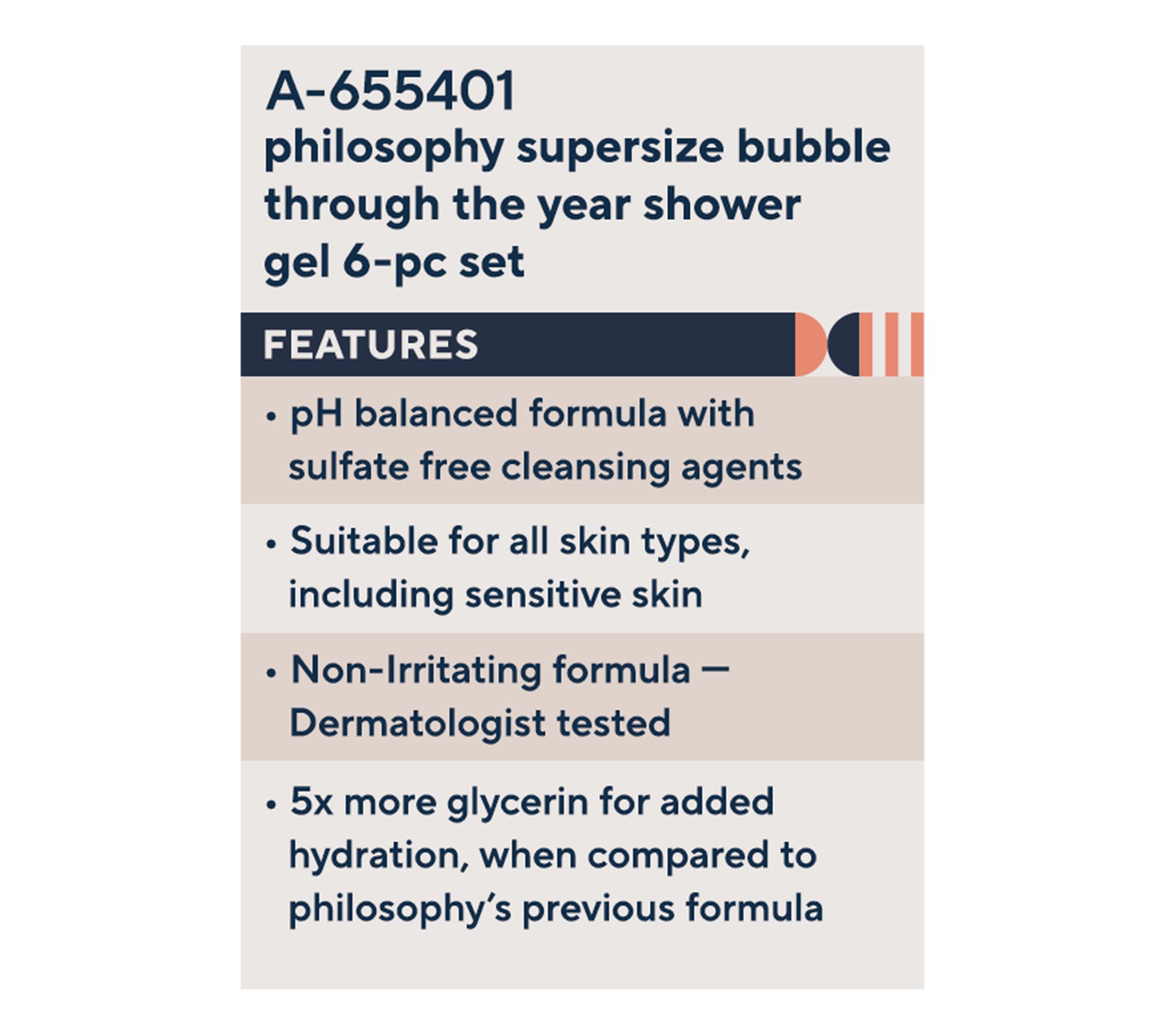 Enjoy six of philosophy's best scents each season has to offer with this bubble through the year collection -- to keep you bubbling all year long! Cleanse yourself head to toe with hydrating shower gel. Multitasking and multisensorial, philosophy's shower gel can be used as a shampoo, shower gel, bubble bath, and/or hand soap. It's formulated to cleanse skin and hair in a cushion of hydration while leaving skin clean and soft.