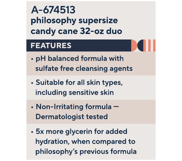 Freshen up with the coldest, coolest snap of a candy cane!! Ultra minty and crisp, philosophy’s candy cane shower gel will be the most invigorating part of your day. Truly a fresh wake up call in the shower, you will be ready to tackle anything that comes your way! philosophy’s newly reformulated sulfate-free hydrating shower gel, bubble bath & shampoo hugs your body skin in lasting hydration without compromising the feel-good scents or luxurious lather that philosophy is famous for.