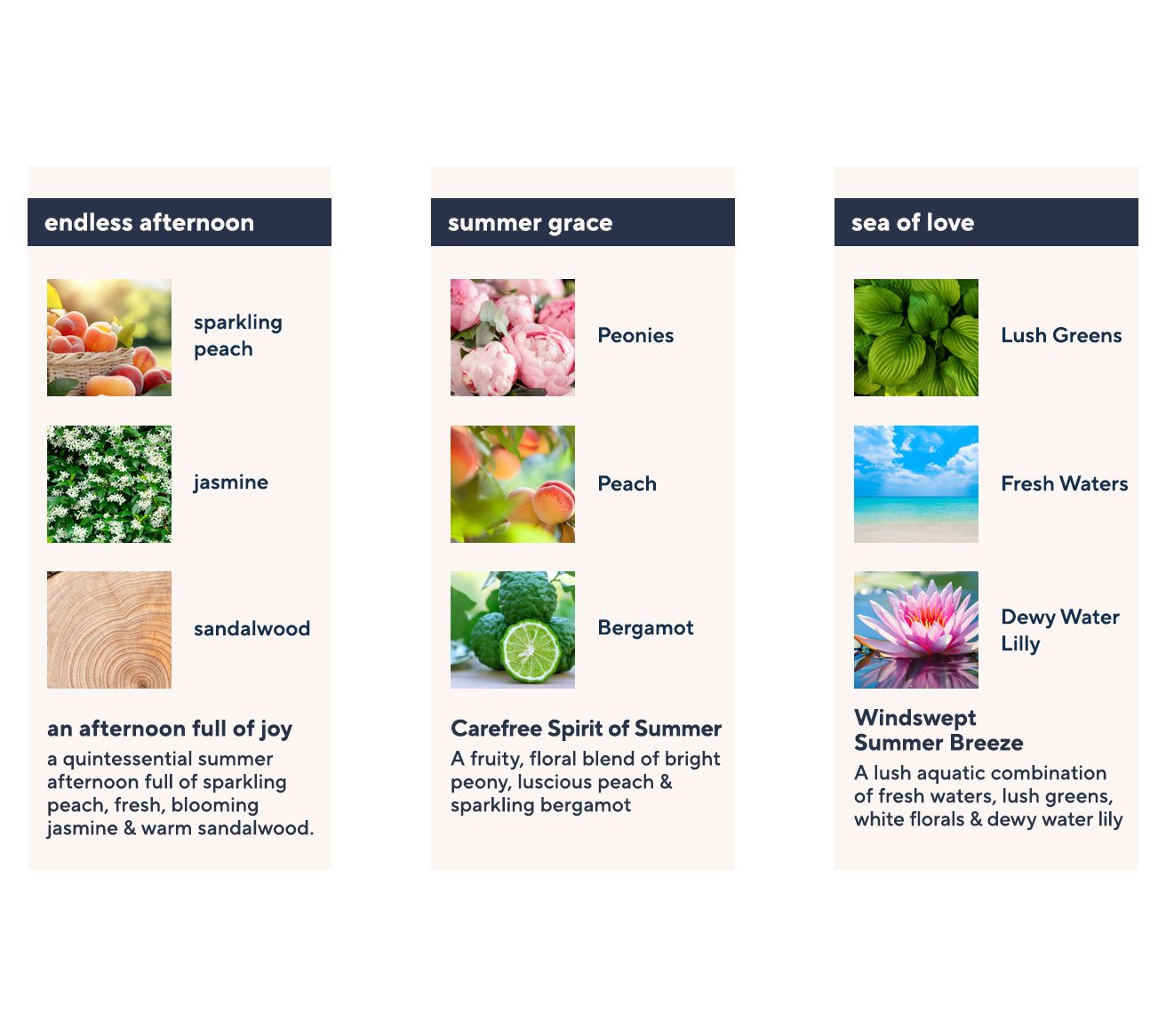 summer grace: a warm, bright floral fragrance of sun-kissed bergamot, passion flower, and warm coconut musk, created to make you feel the lighthearted happiness and ease of summer