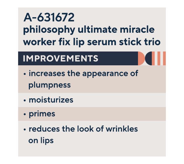 With philosophy's simple one-step multitasking lip serum, the appearance of fine lines are improved while the appearance of plumpness and volume of the lips is increased. It helps provide lips with moisture, increase the appearance of lip volume, and improve the appearance of wrinkles. It leaves lips feeling nourished.