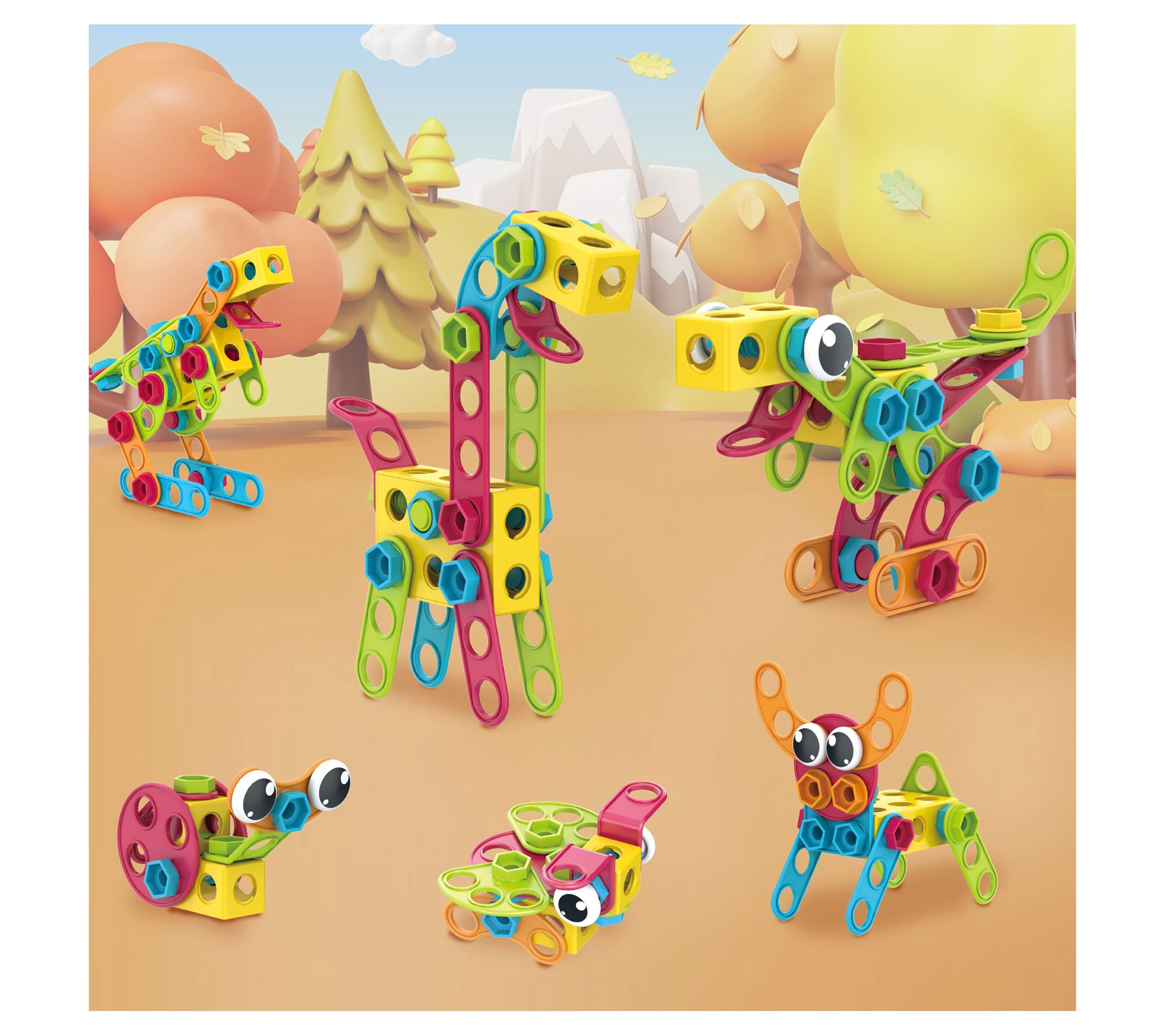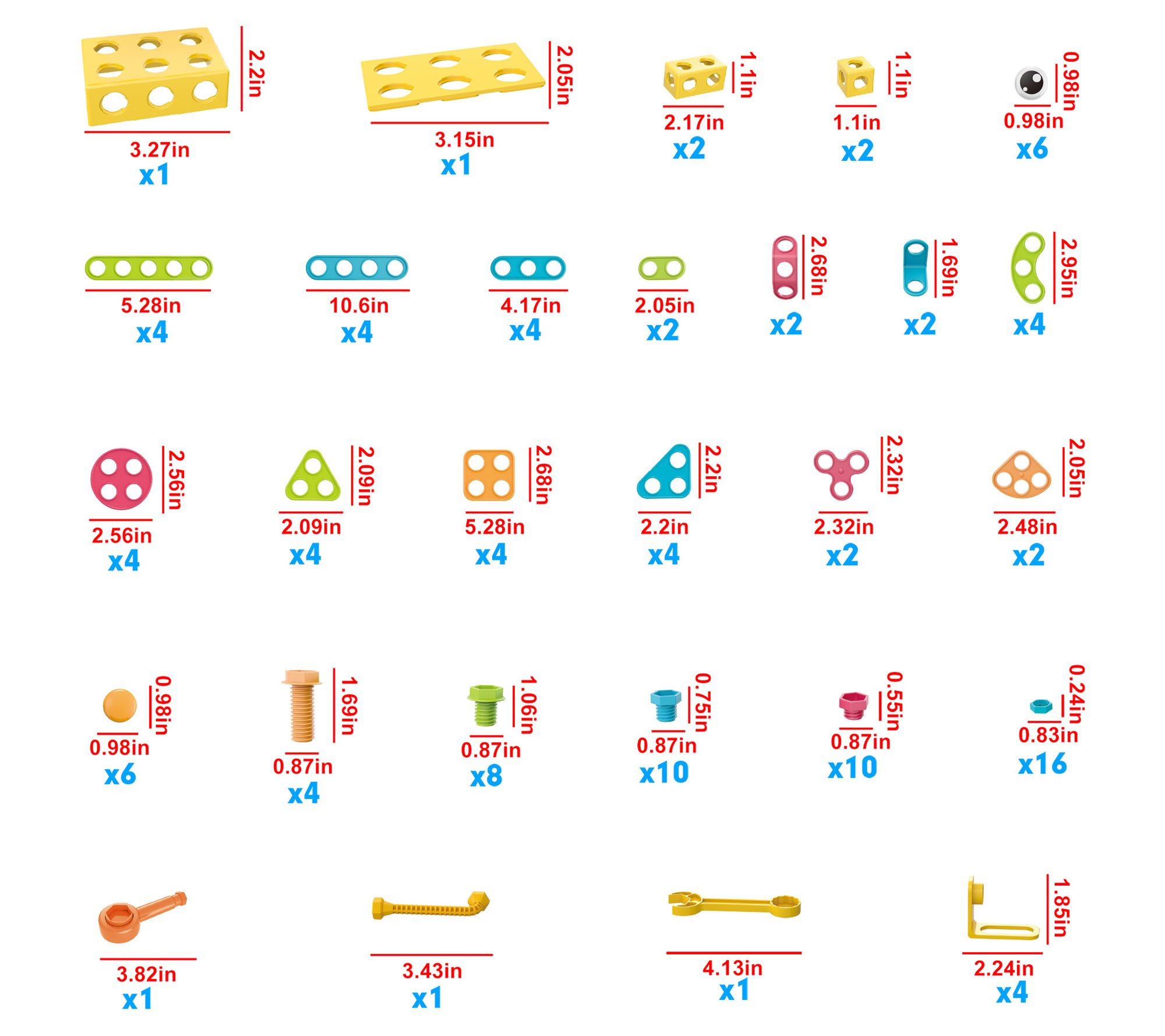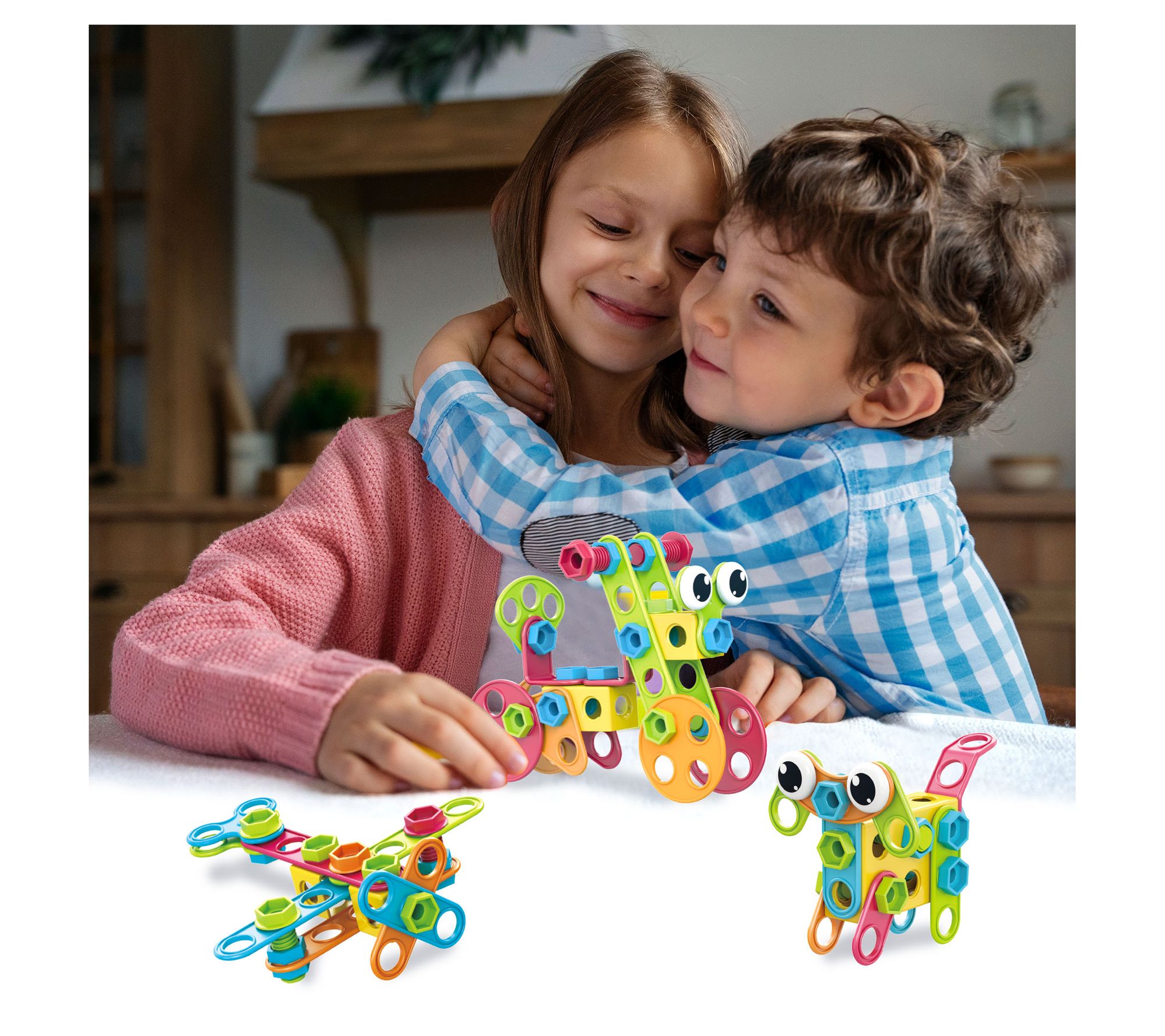 • Includes 48 geometric designed nuts and bolts, 64 versatile engineered block pieces, and three tools