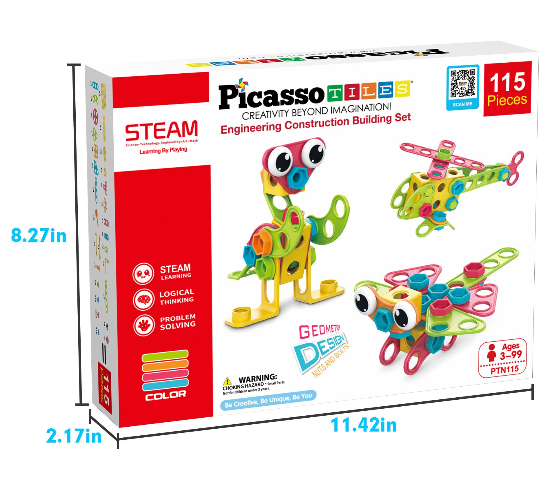 Engage curious minds and foster creativity with this comprehensive engineering construction set. Ideal for budding engineers, this 115-piece set transforms playtime into a dynamic STEM learning experience. It includes three practical tools to tighten components, helping to enhance fine motor skills and dexterity. With a variety of colorful blocks and connectors, kids can design and build limitless structures, igniting their problem-solving skills and imagination. Perfect for educational play at home or in an interactive classroom setting. From PicassoTiles.