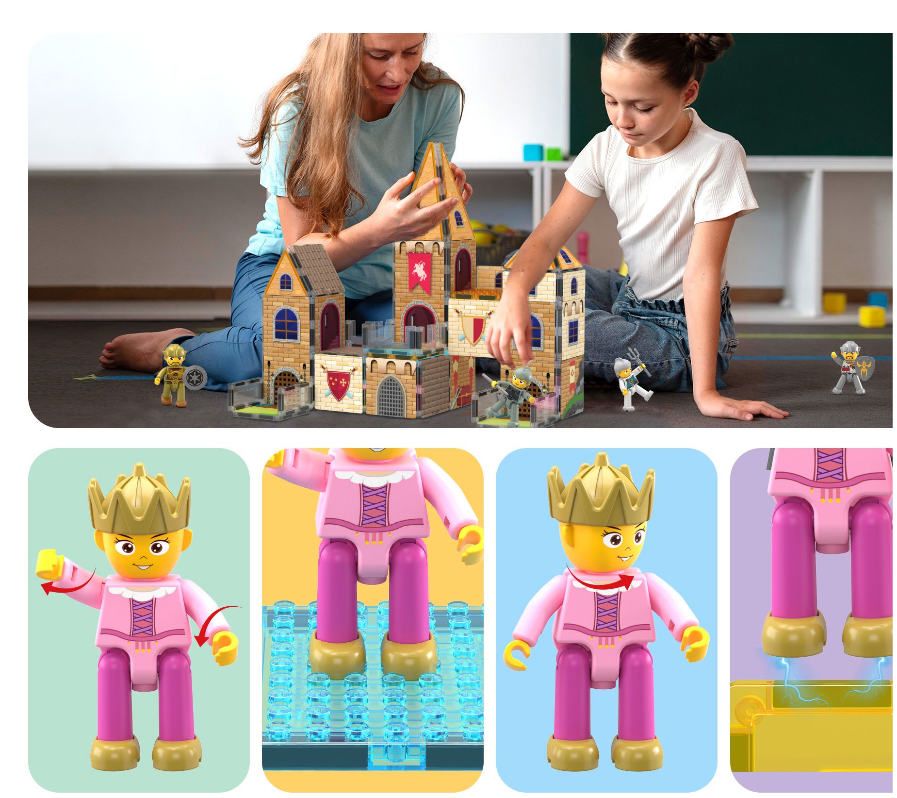 • Includes eight character action figures, eight character action figure accessories, 52 magnet tiles some with themes printed, and two magnet tiles with brick surface connectors