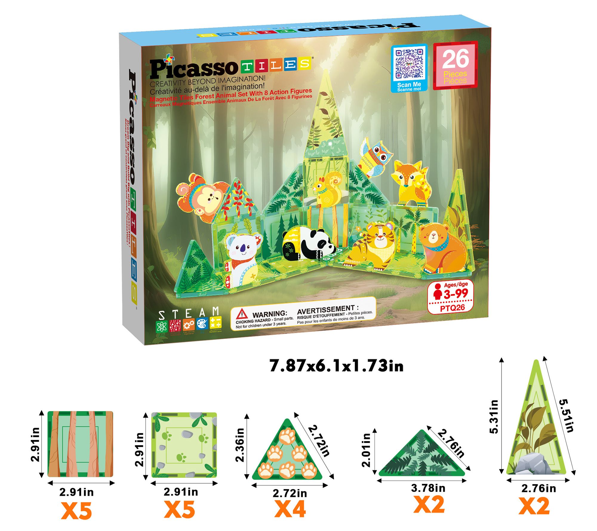 • Includes four isosceles triangles, four equilateral triangles, 10 squares, and eight Forest Character Action Figures