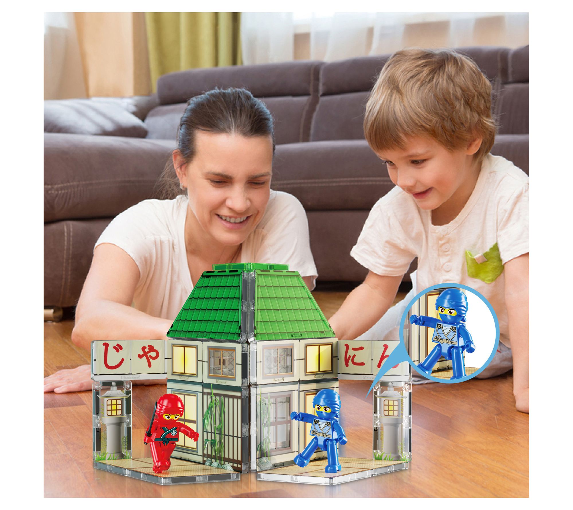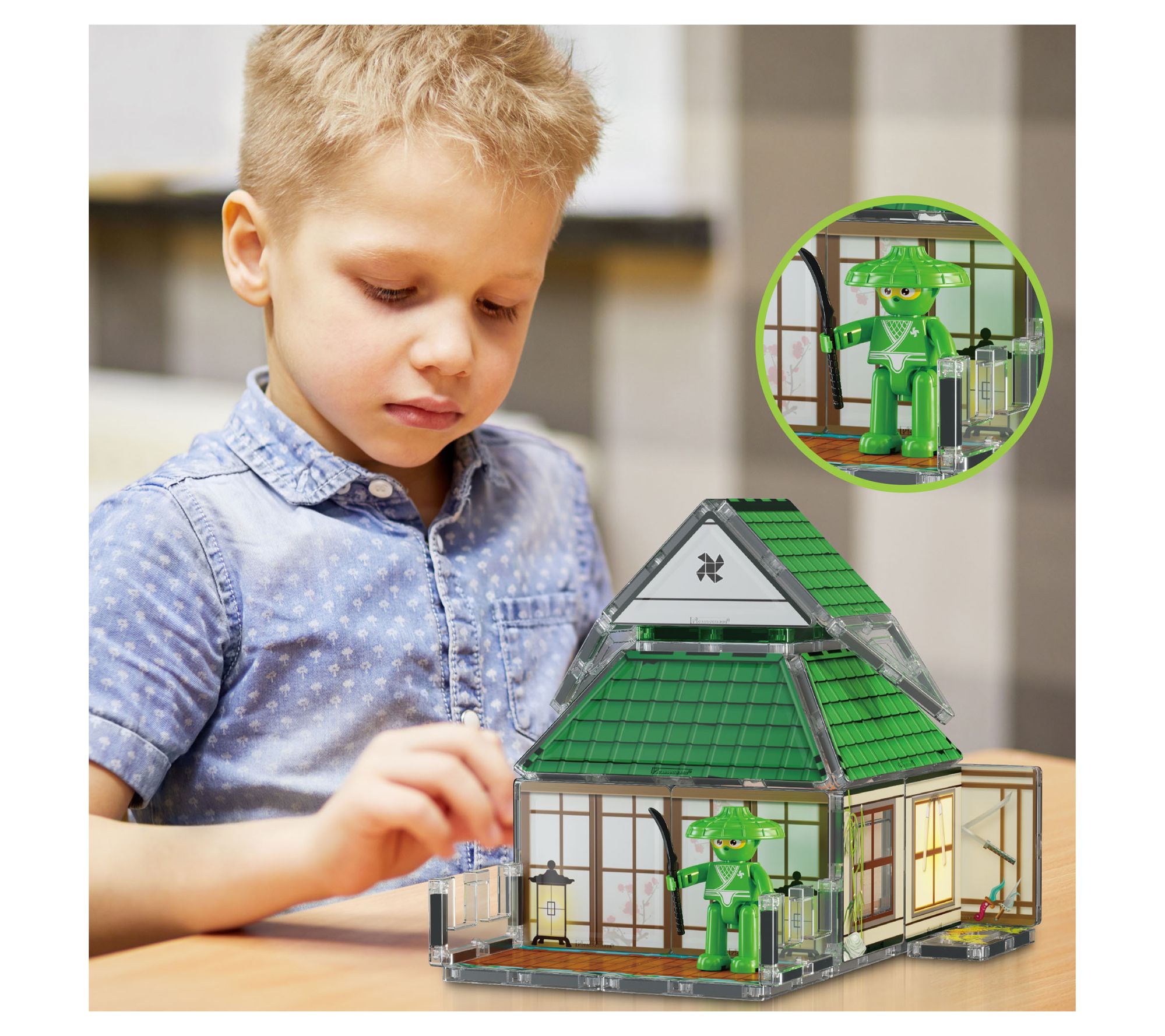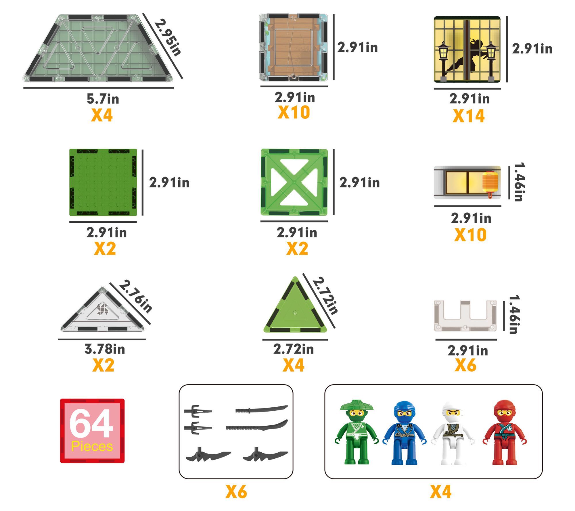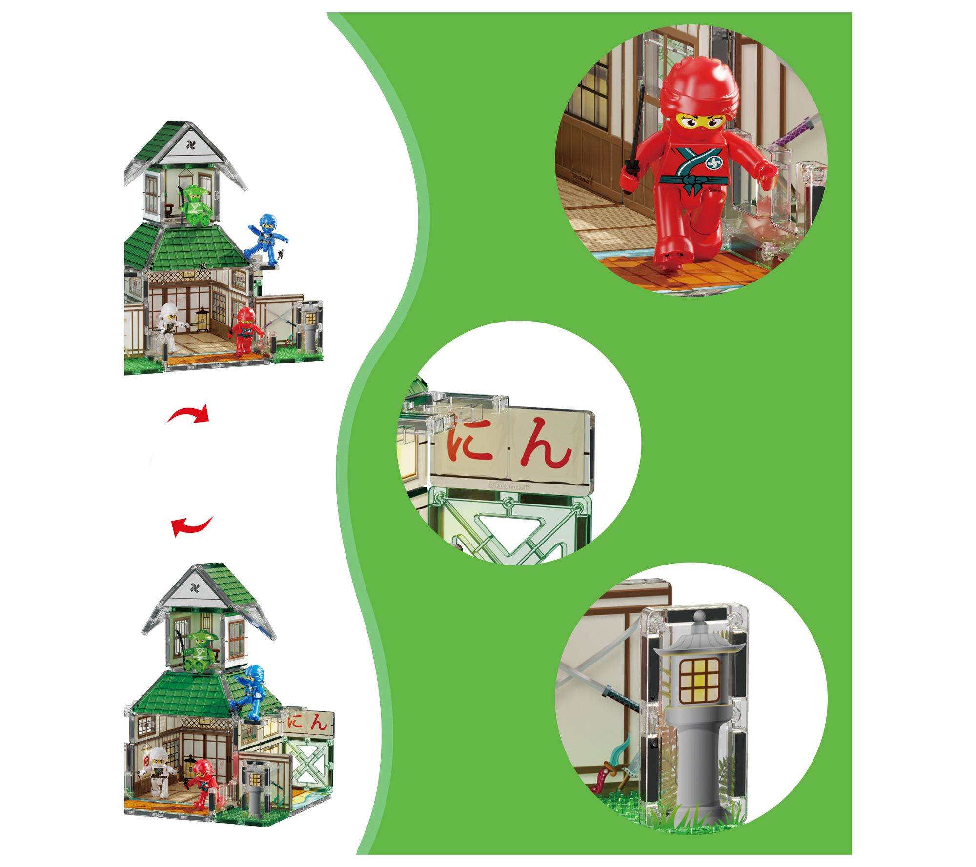 • Includes four ninja character action figures with magnetized feet, six ninja weapon accessories, 52 magnet building pieces, and two magnetic brick tiles with surfaces that allow for connecting brick blocks