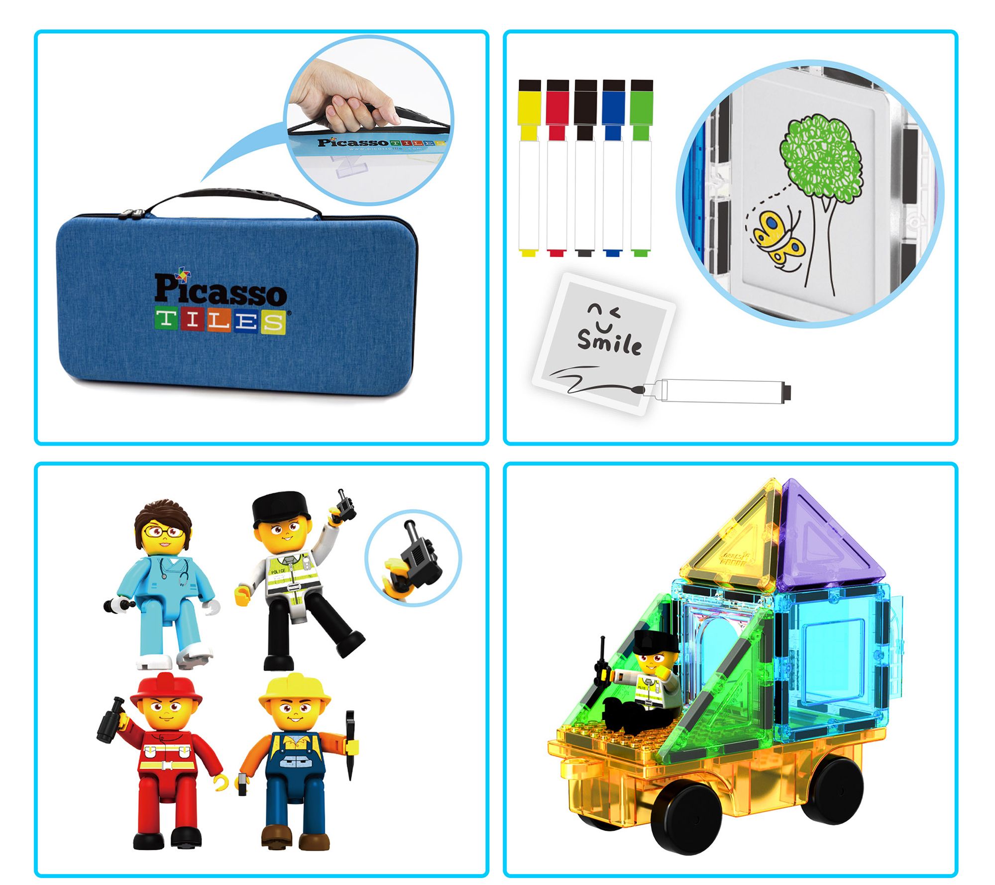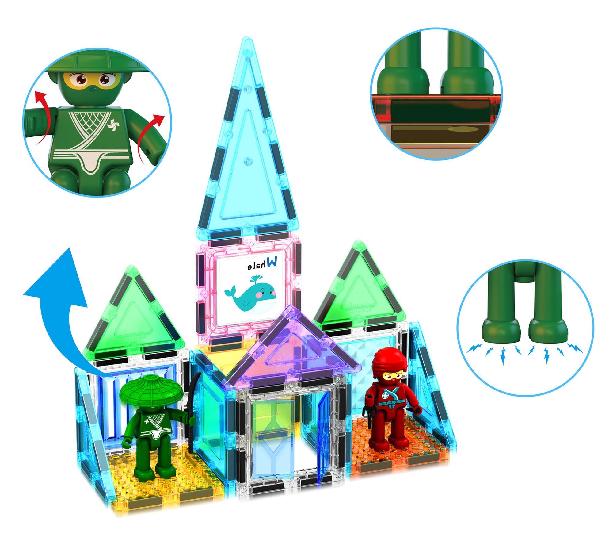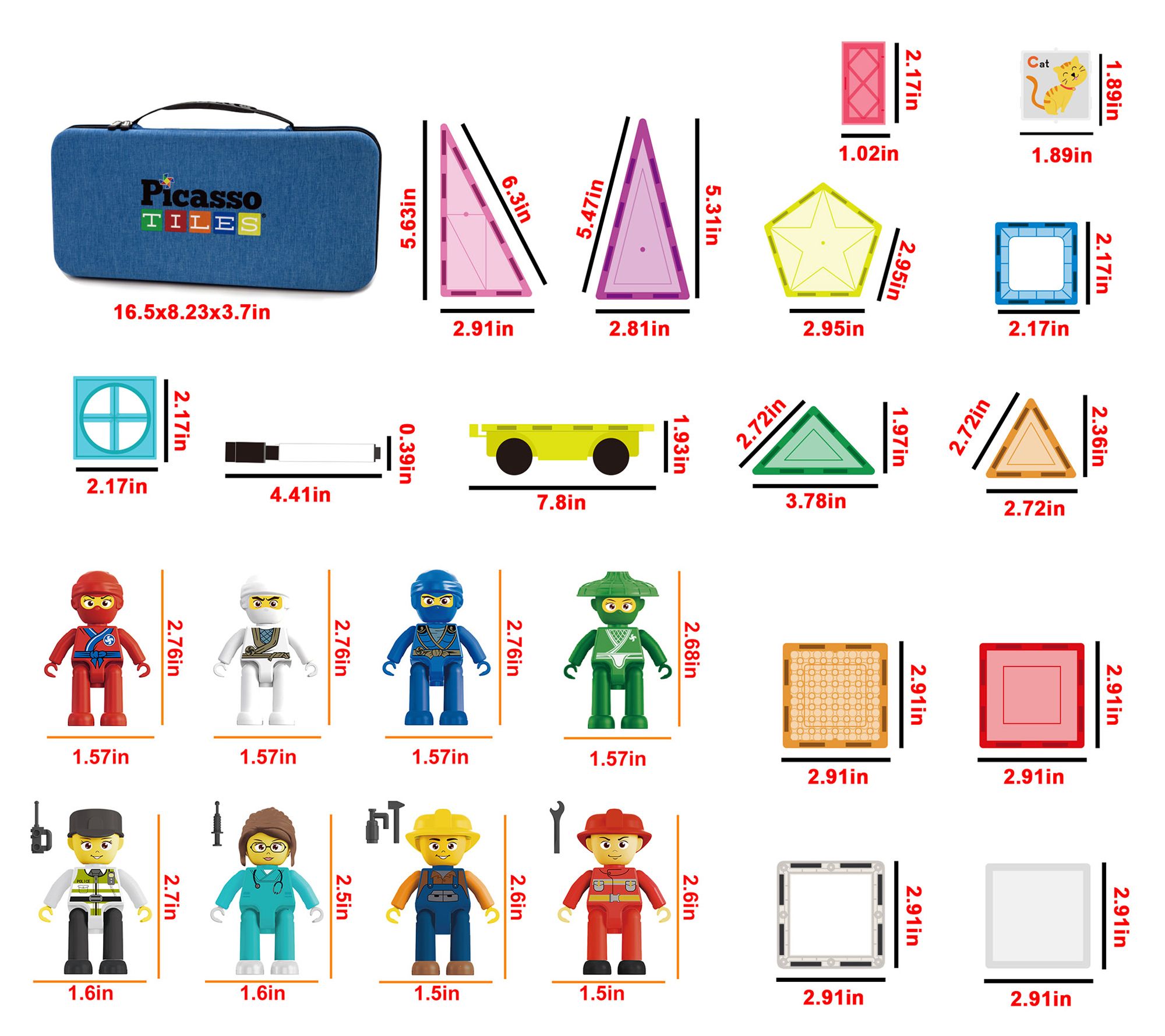 • Includes eight character action figures, 11 character accessory weapons, five erasable markers, toy storage box case, car base, and 74 various magnet tiles