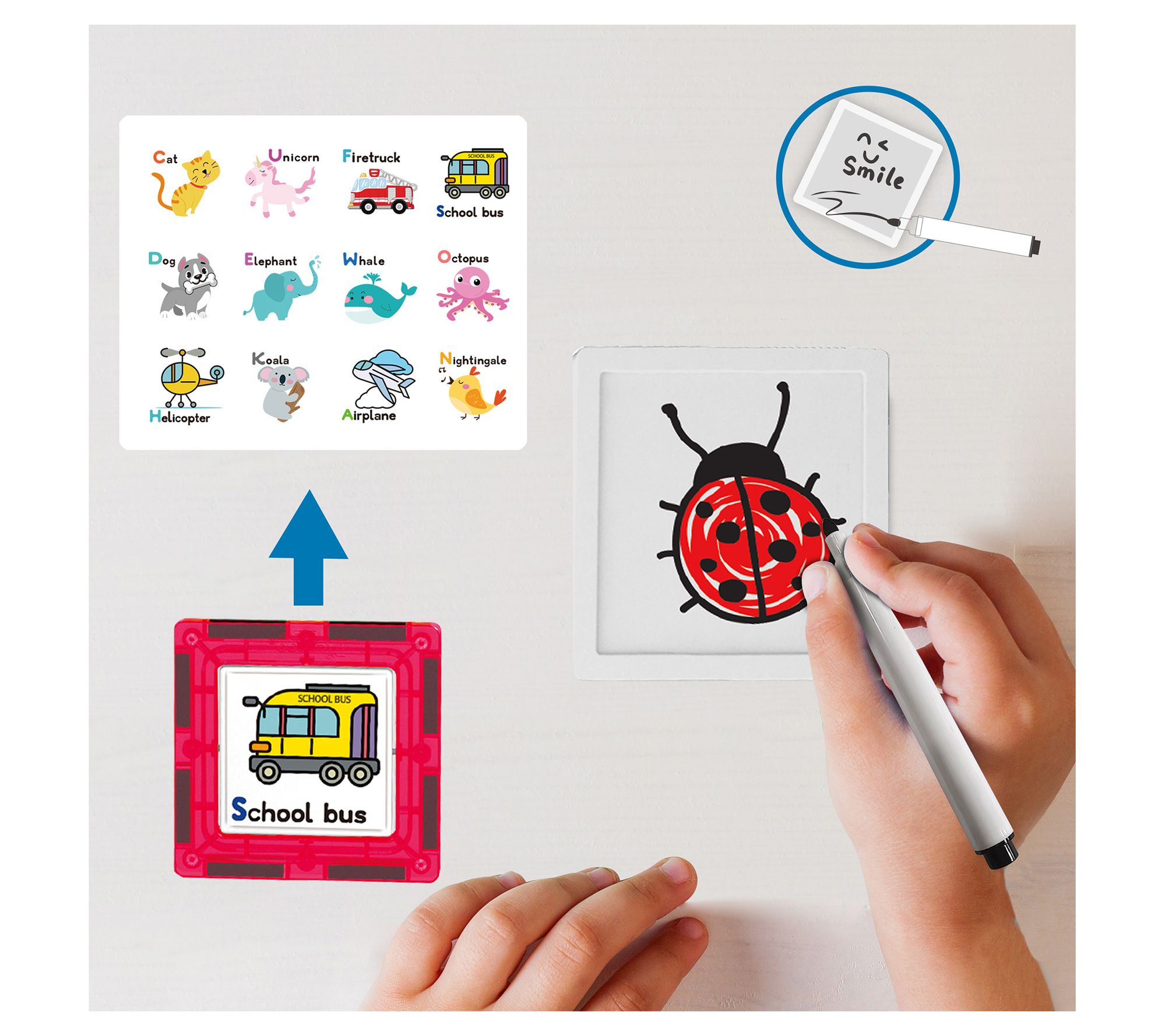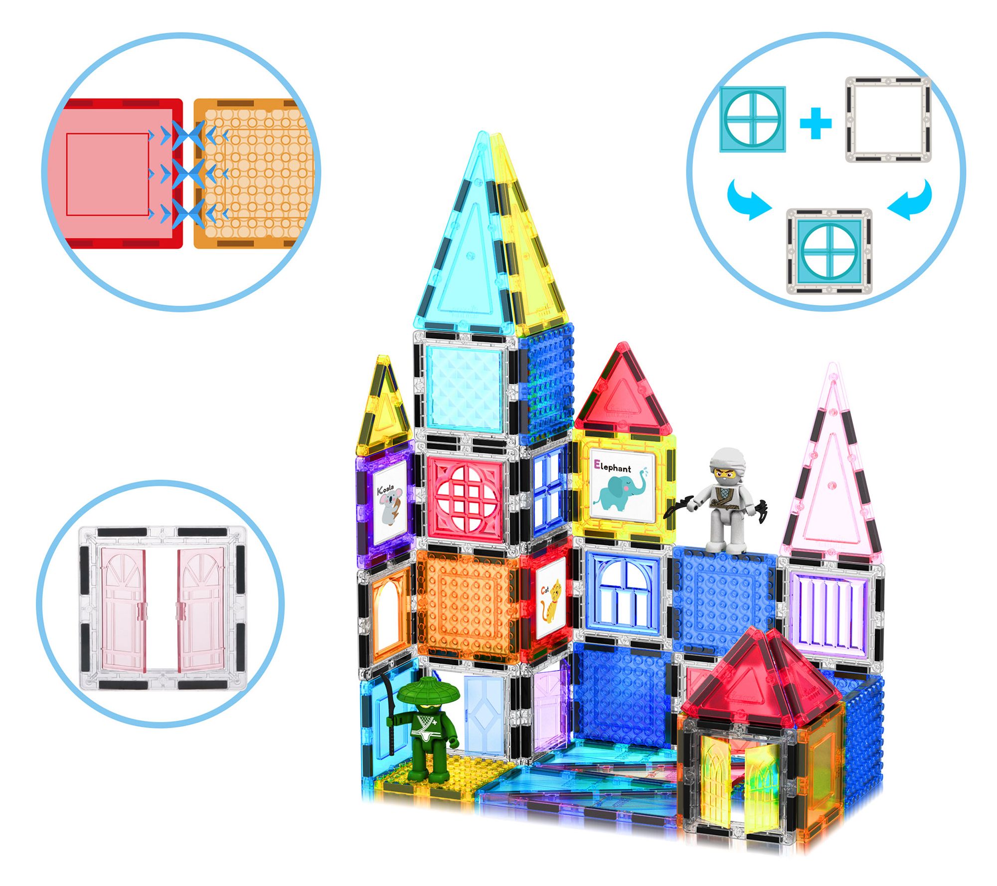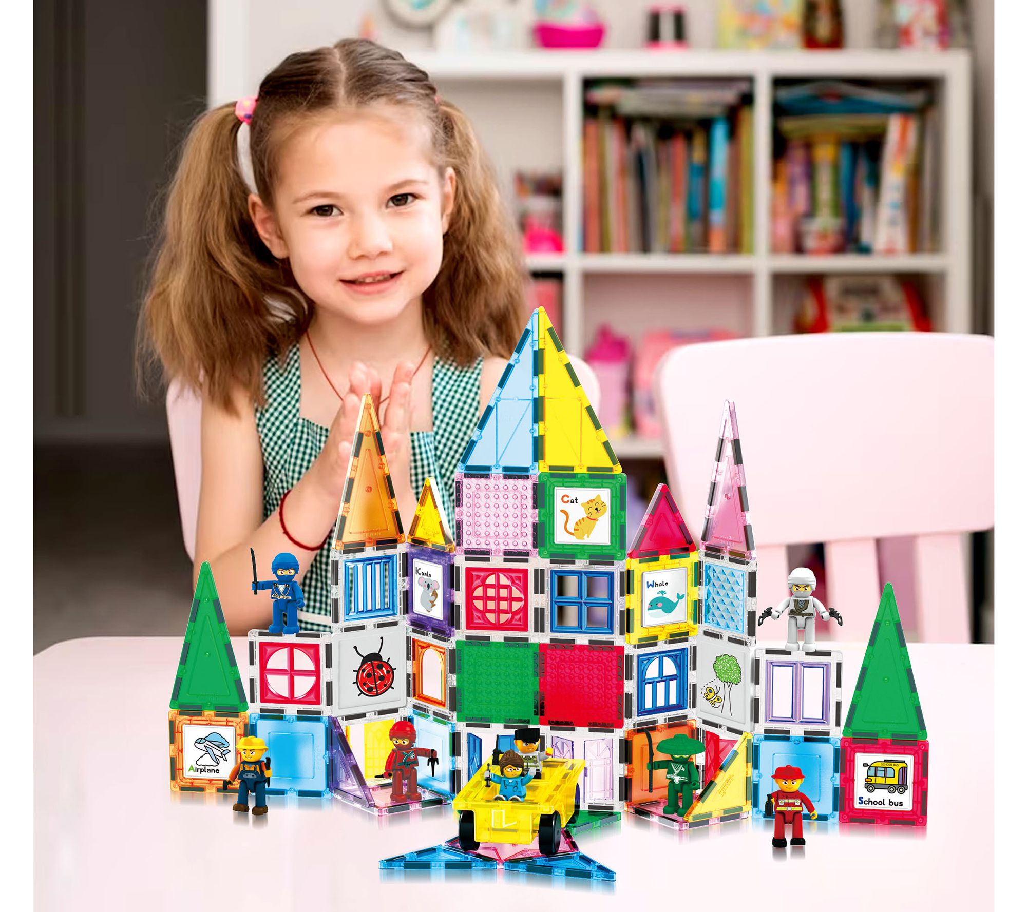 • Includes eight character action figures, 11 character accessory weapons, five erasable markers, toy storage box case, car base, and 74 various magnet tiles