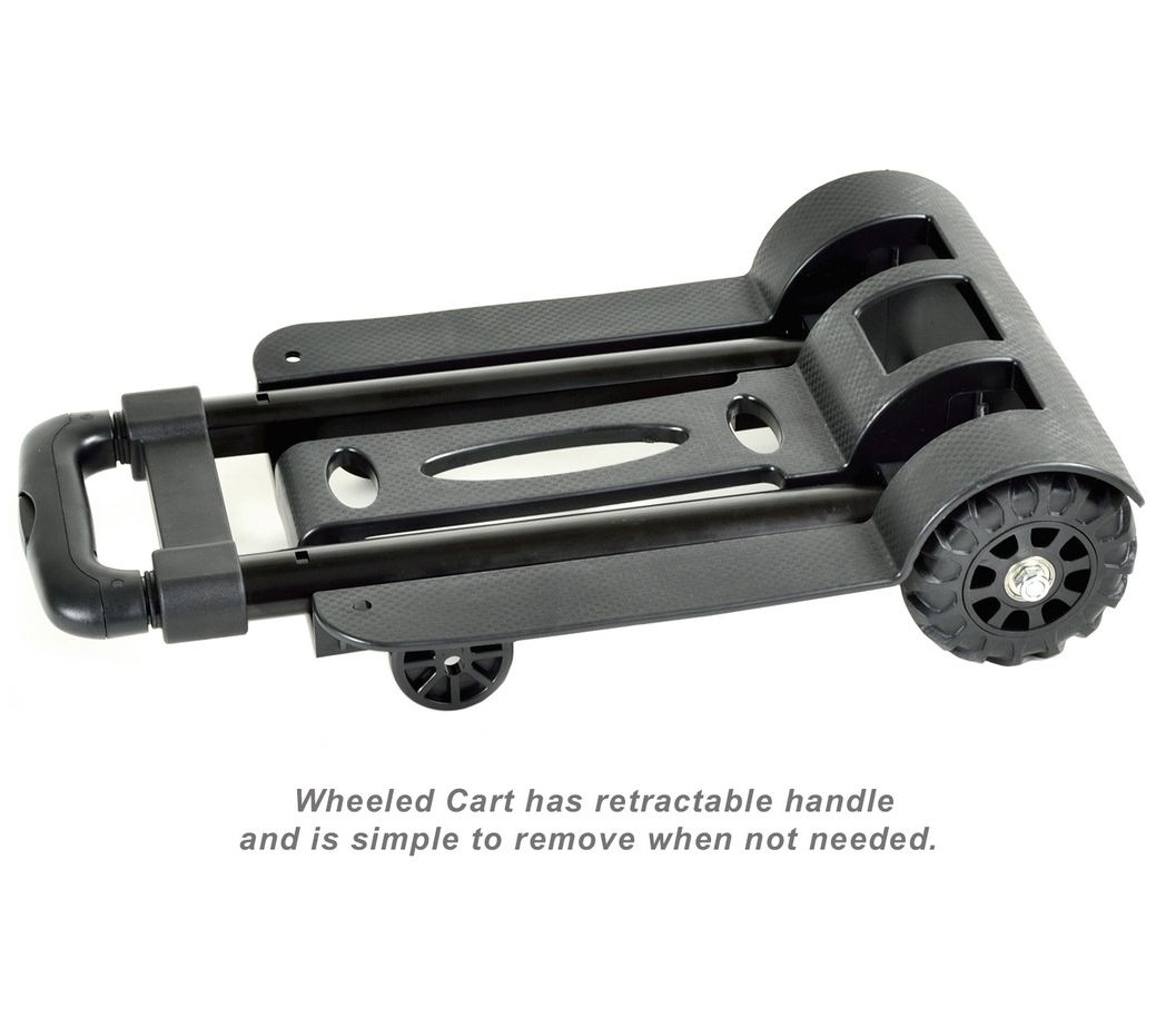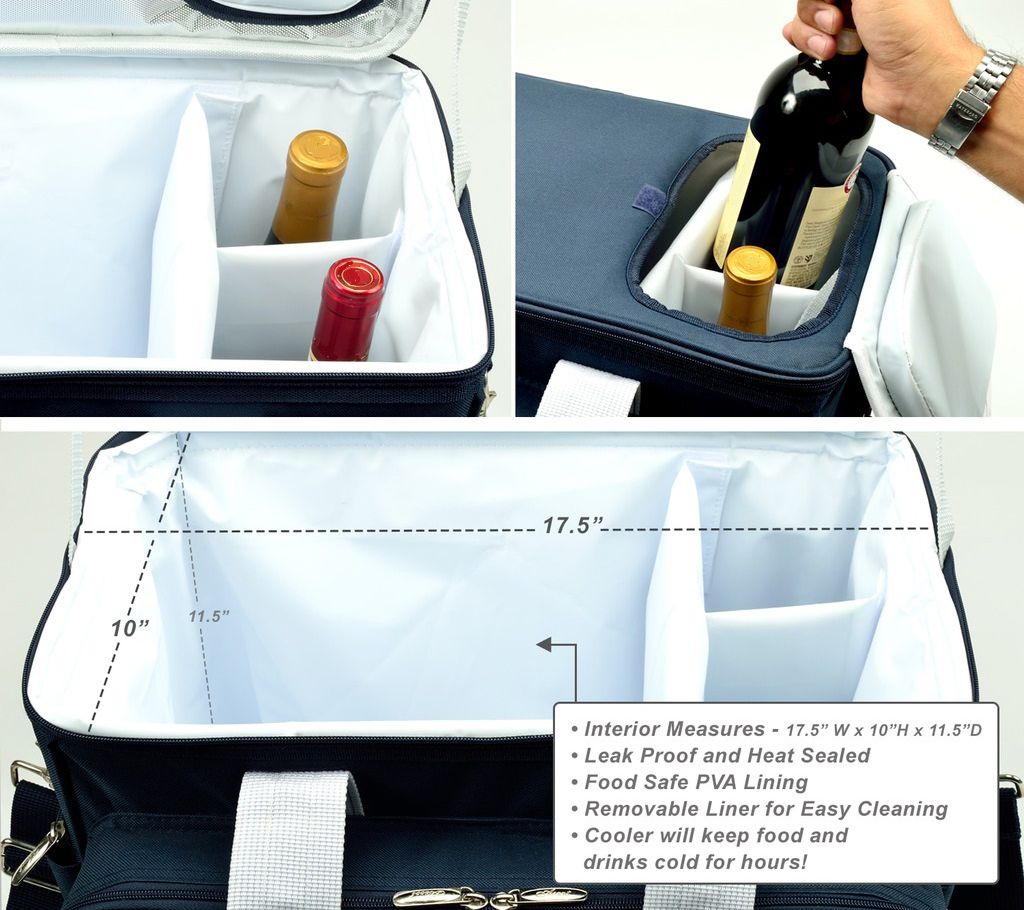 • Includes picnic cooler, four 9" melamine plates, four 13" x 13" cotton napkins, four stainless steel forks, four stainless steel knives, four stainless steel spoons, four 8-oz acrylic wine glasses, hardwood cheese board, cheese knife, combination corkscrew, spill-proof salt and pepper shakers, and removable wheeled cart