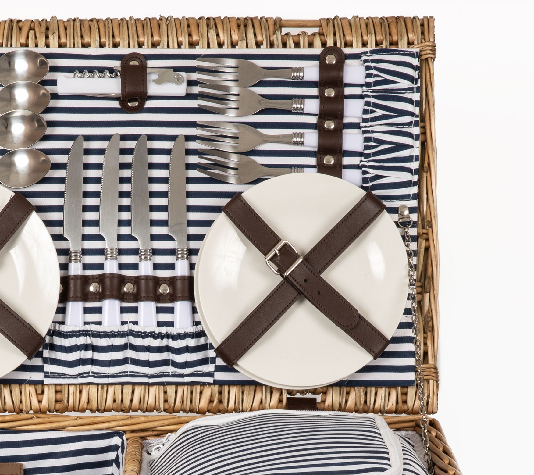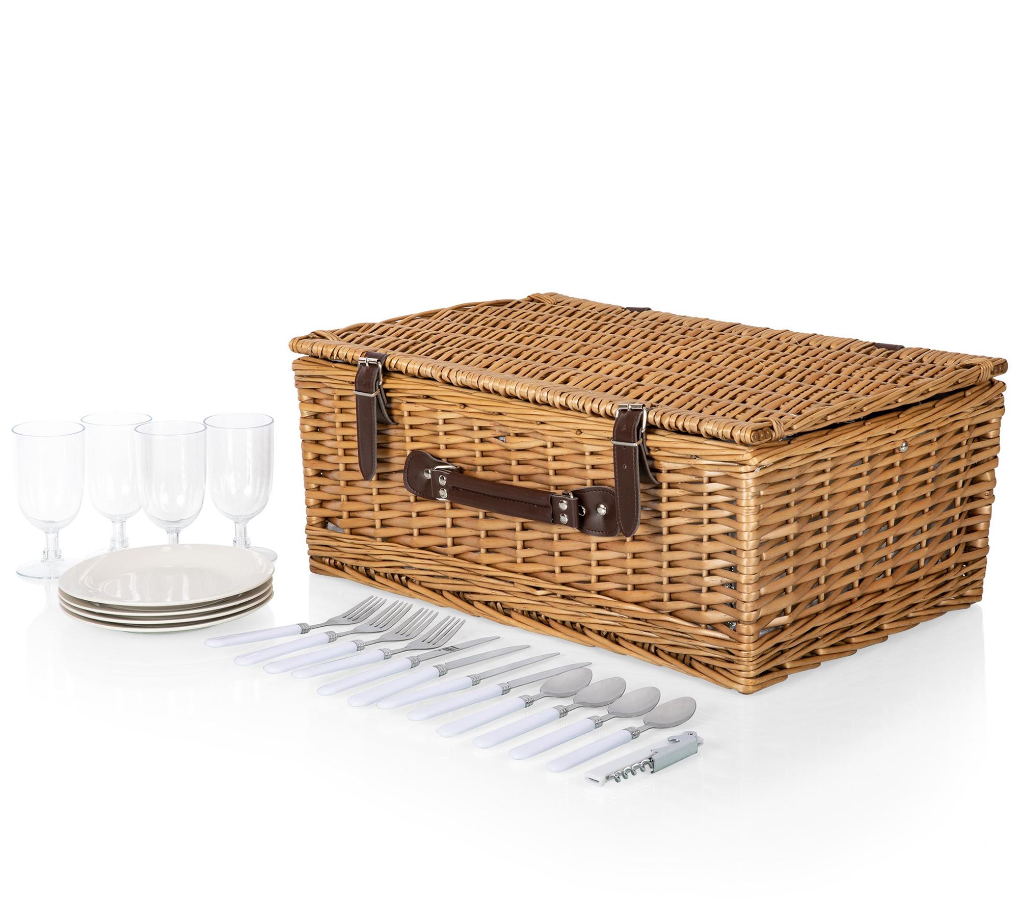• Includes picnic basket, four 7" porcelain plates, four 8-oz wine glasses, four forks, four knives, four spoons, and corkscrew