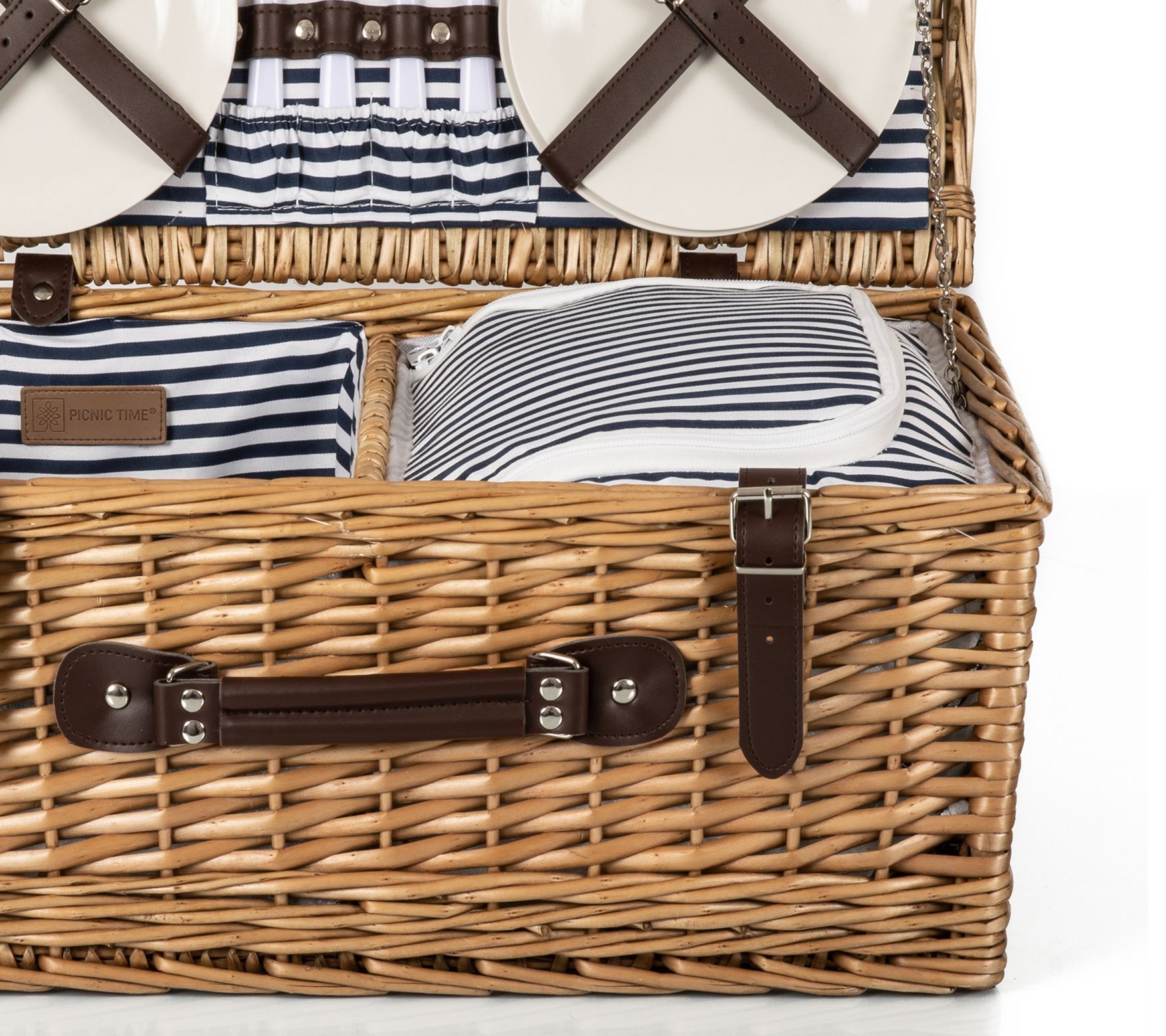 A portable party for four, this woven wicker basket is pre-packed with picnic-perfect place settings, making it elegant and easy to have a gourmet meal anywhere you go. From Picnic Time.