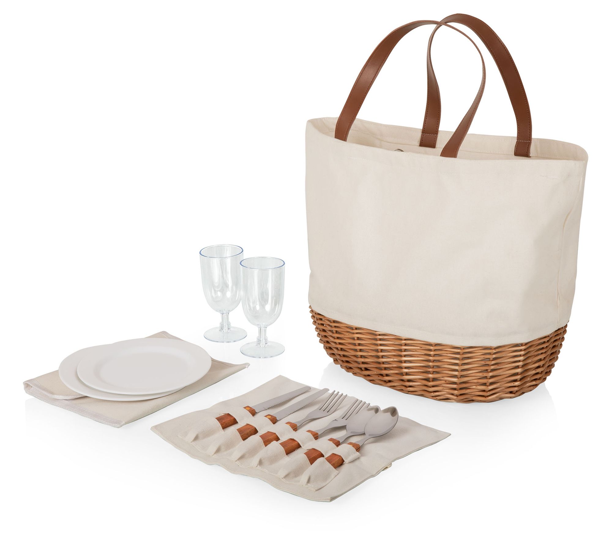 • Includes picnic basket, plate pouch, two wine glasses, two forks, two knives, two spoons, and roll-up flatware pouch
