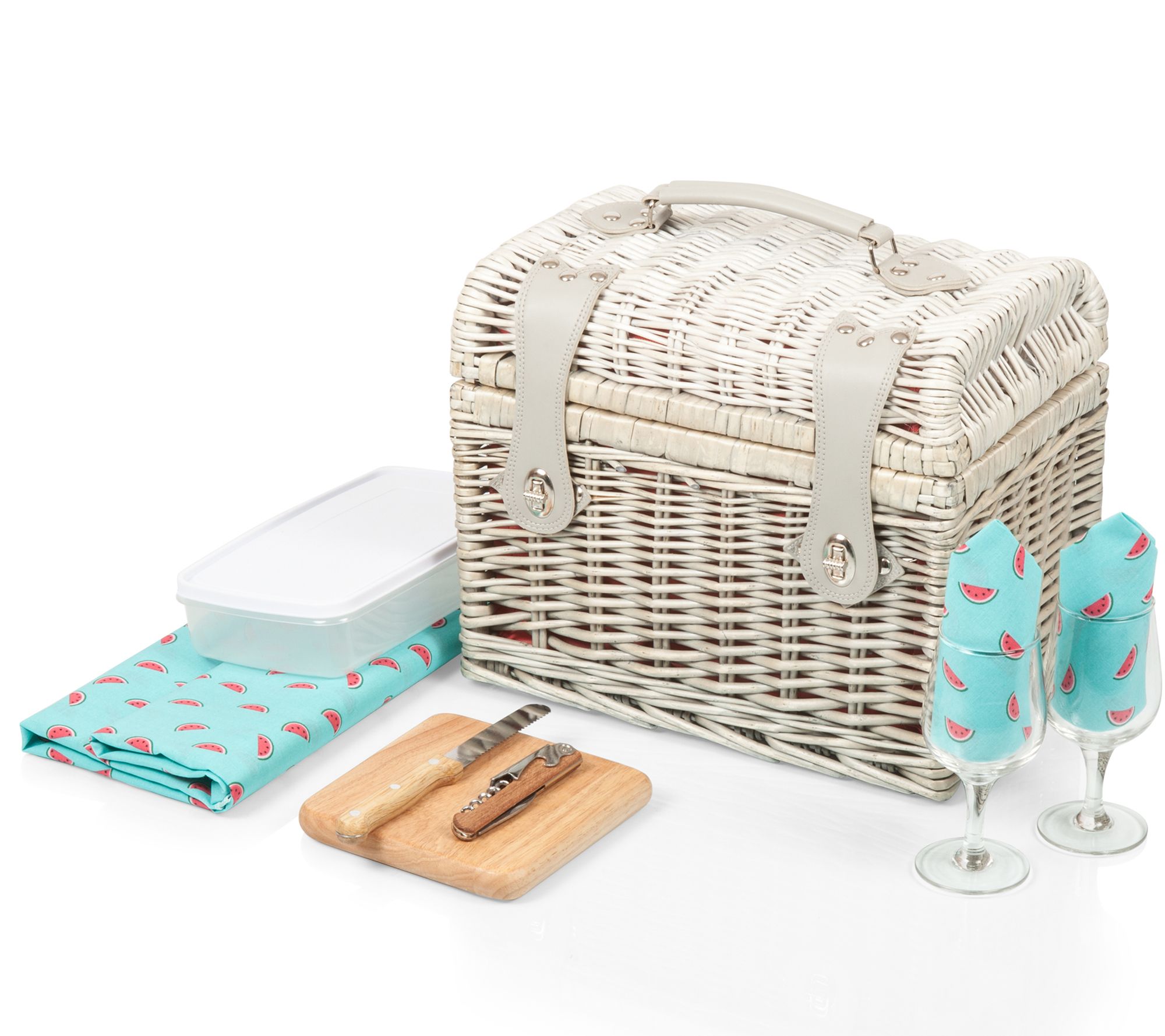 • Includes picnic basket, two wine glasses, cutting board, corkscrew, cheese knife, two napkins, food container, and tablecloth