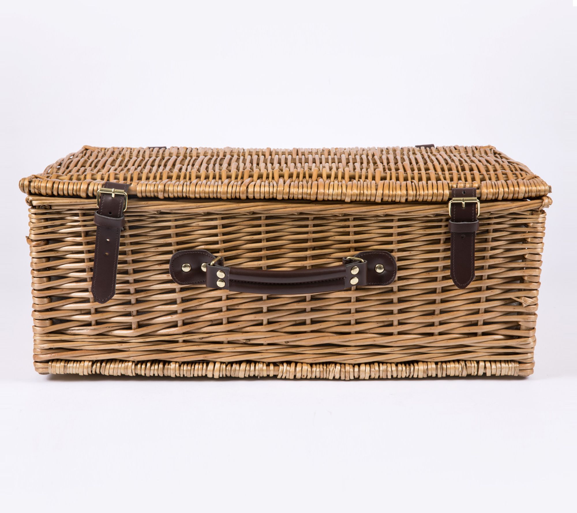 • Includes picnic basket, four plates, four wine glasses, four forks, four knives, four spoons, corkscrew, and salt and pepper shakers