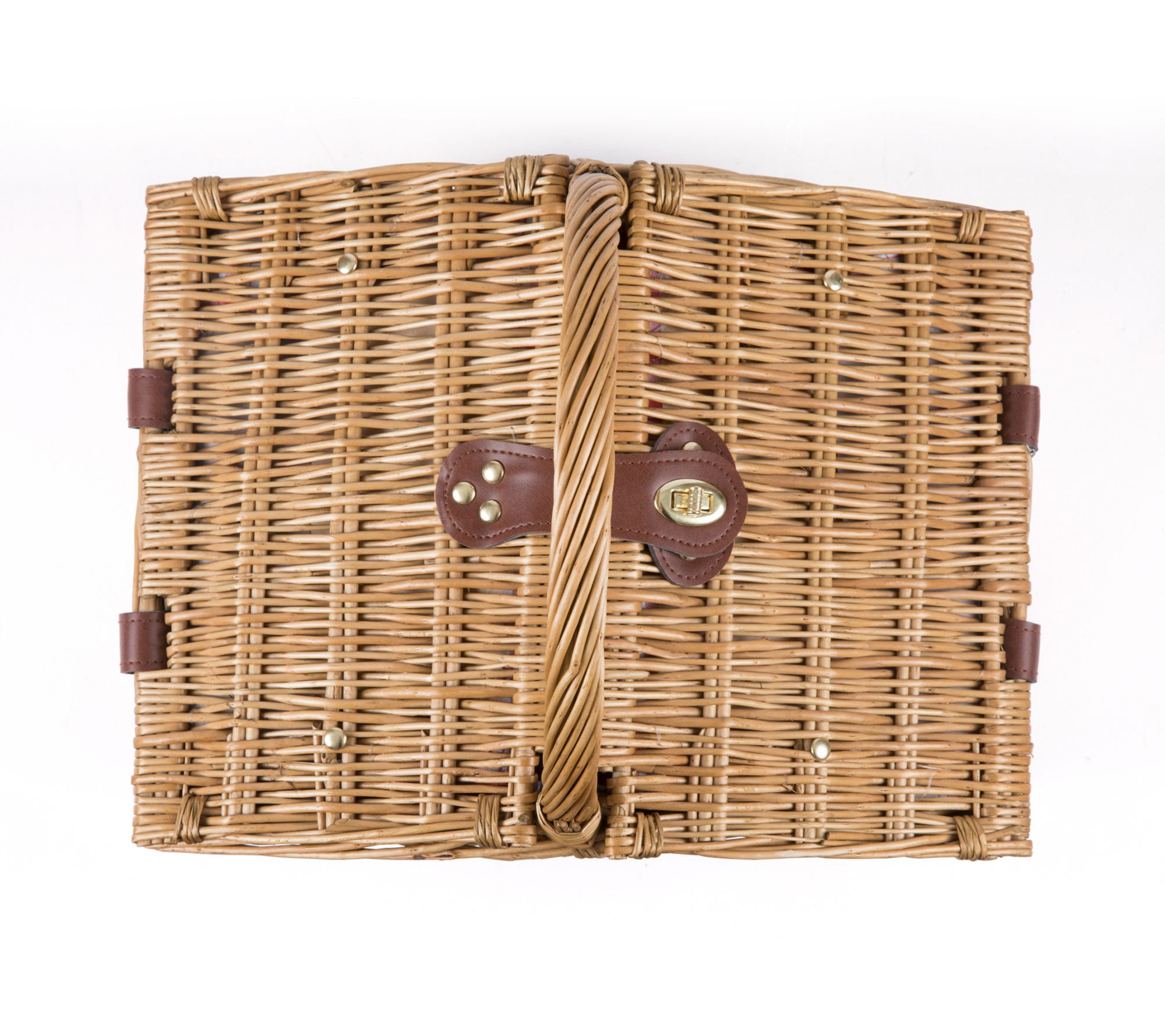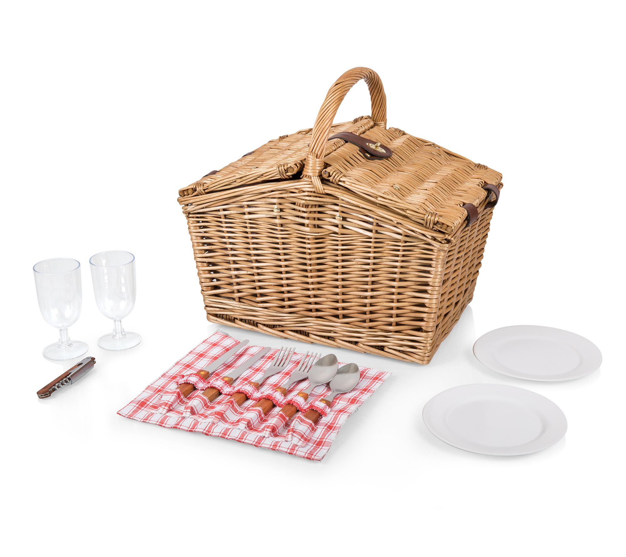 • Includes willow picnic basket, four 8"Diam porcelain plates, two 7-oz wine glasses, two teaspoons, two knives, two forks, waiter-style corkscrew, two 8"Diam melamine plates, and flatware pocket