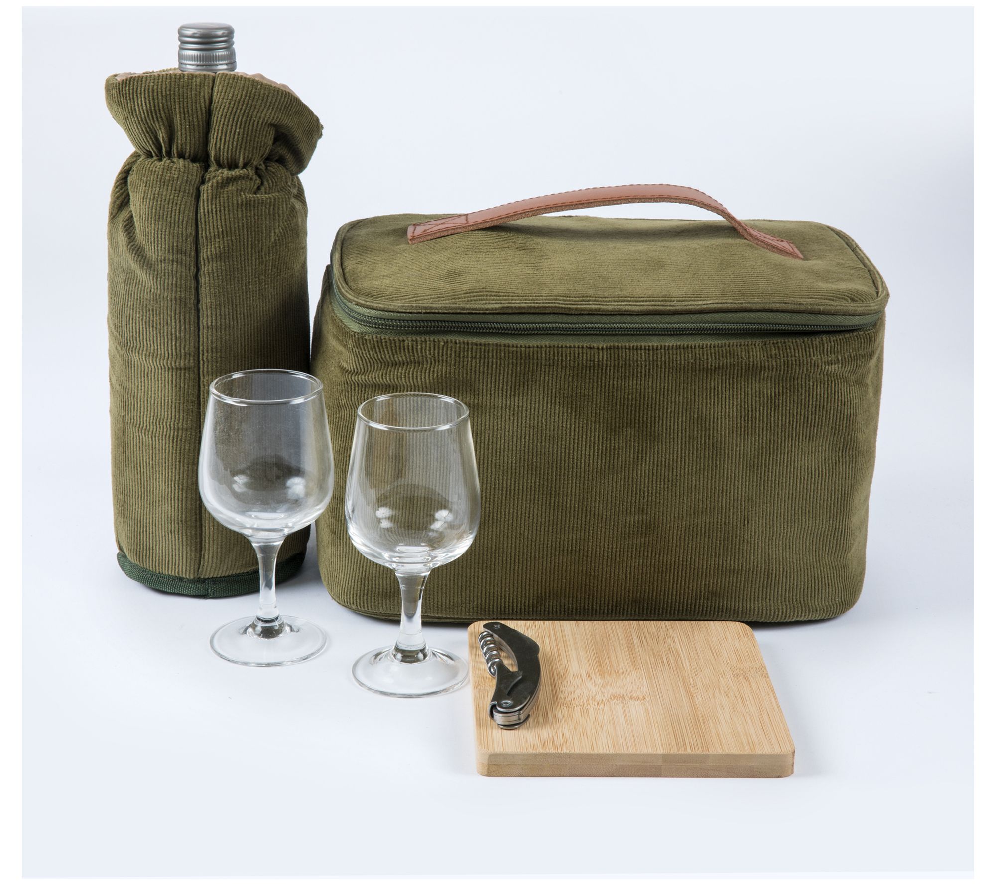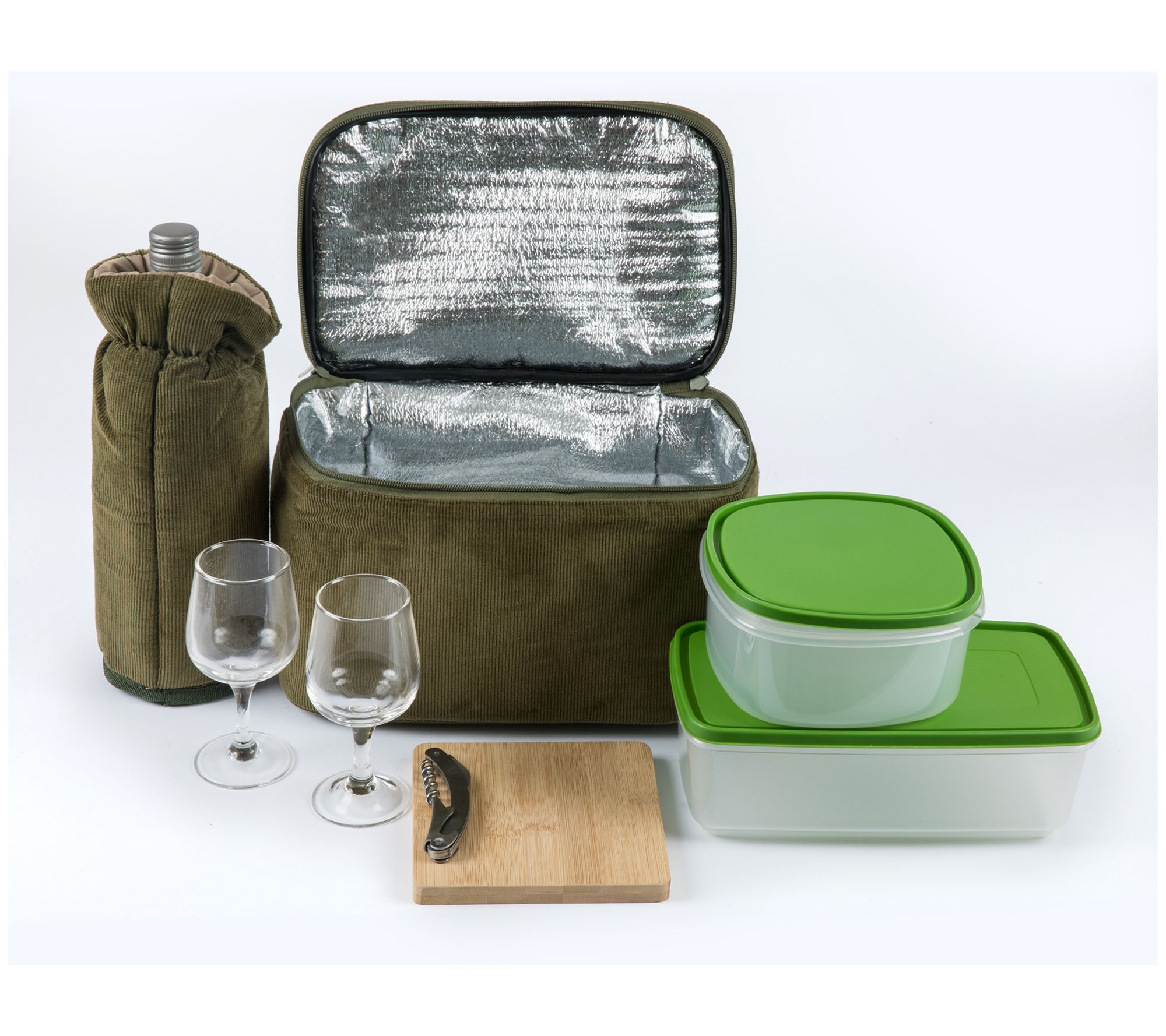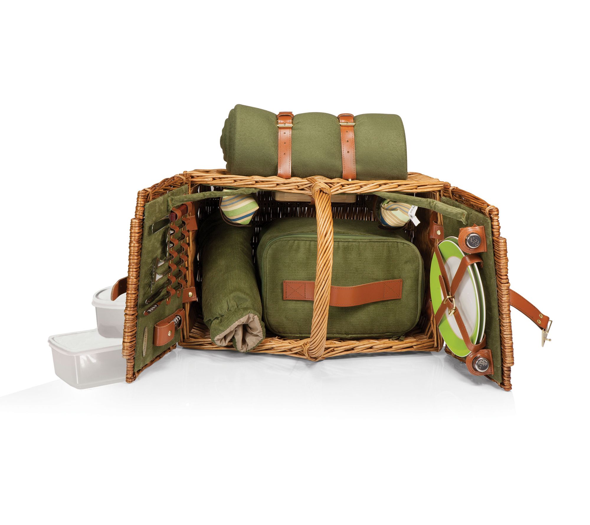 • Includes picnic basket, two porcelain plates, two hand-blown wine glasses, two stainless steel forks, two stainless steel knives, two stainless steel spoons, stainless steel cheese knife with wooden handle, hardwood cutting board, stainless steel corkscrew, stainless steel salt and pepper shakers, two napkins, insulated corduroy wine duffel, insulated corduroy zipper-top cooler, two plastic food storage containers, and acrylic fleece picnic blanket