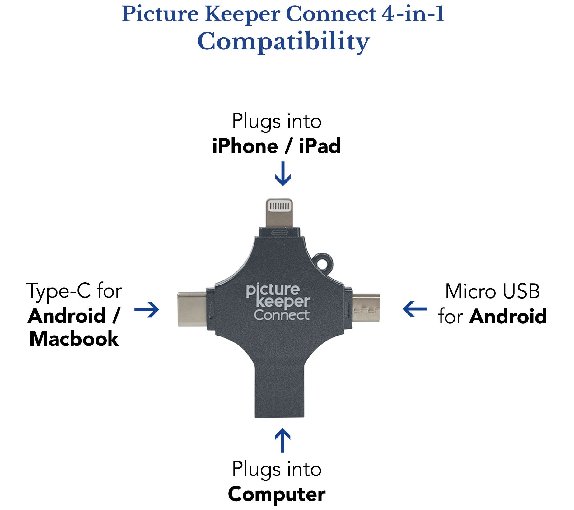 Your precious memories deserve to be protected (think: a grandchild's first home run, your niece's dance recital, Christmas morning, family reunions, and we could go on!). With this Picture Keeper device, you can easily and efficiently backup photos, videos, and contacts -- safeguarding those treasured files while making room for new magical memories. Just download the app, plug Picture Keeper into your device, and tap Start Backup. It's that simple! Plus, you can edit and customize your photos and videos in the app with nifty features like the Magic Erase tool and fun filter options. And with the updated 4-in-1 design, you won't need to fumble around for an adapter -- the built-in connectors are always ready to pop into your smartphone, tablet, or computer. From Picture Keeper.