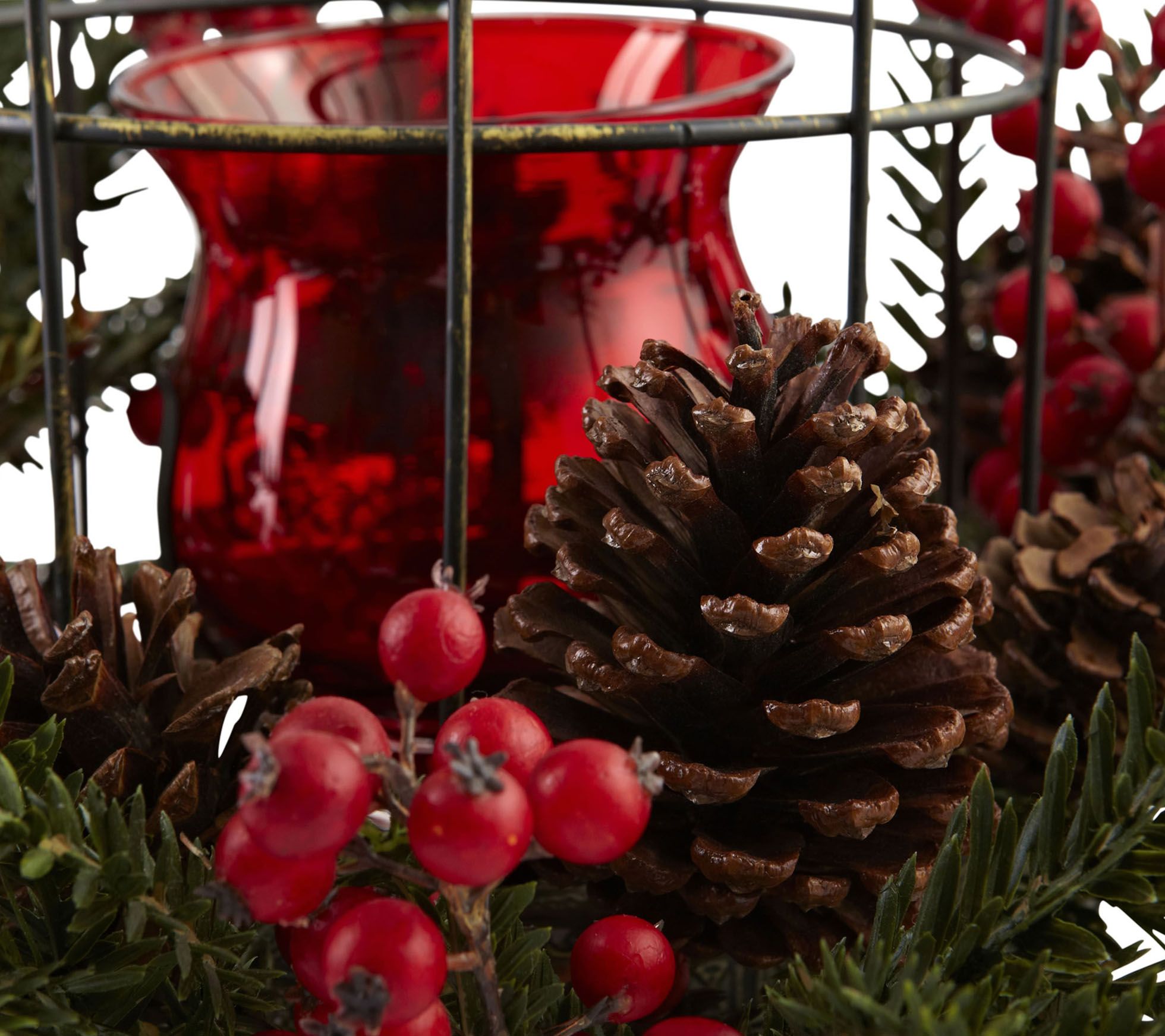 • Deep red candelabrum inside a birdhouse-style housing surrounded by faux pine berries, sprigs, and pinecones