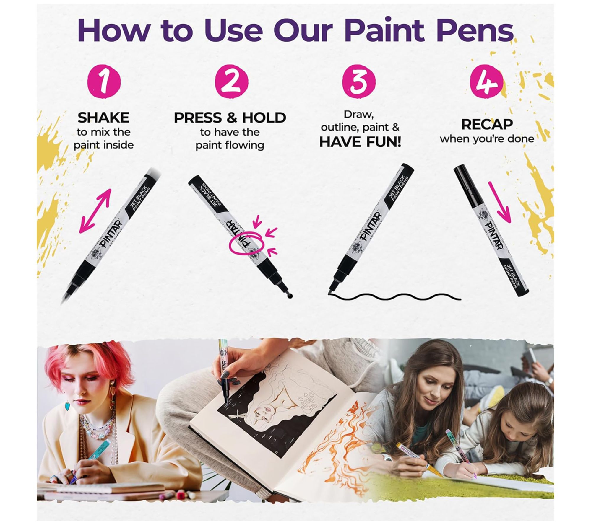 Experience the joy of creating vibrant, detailed artwork with Pintar black and white paint markers. Perfect for painting on surfaces like rocks, glass, or pottery, these versatile markers offer endless creative possibilities.They ensure smooth application and lasting color. From Pintar.