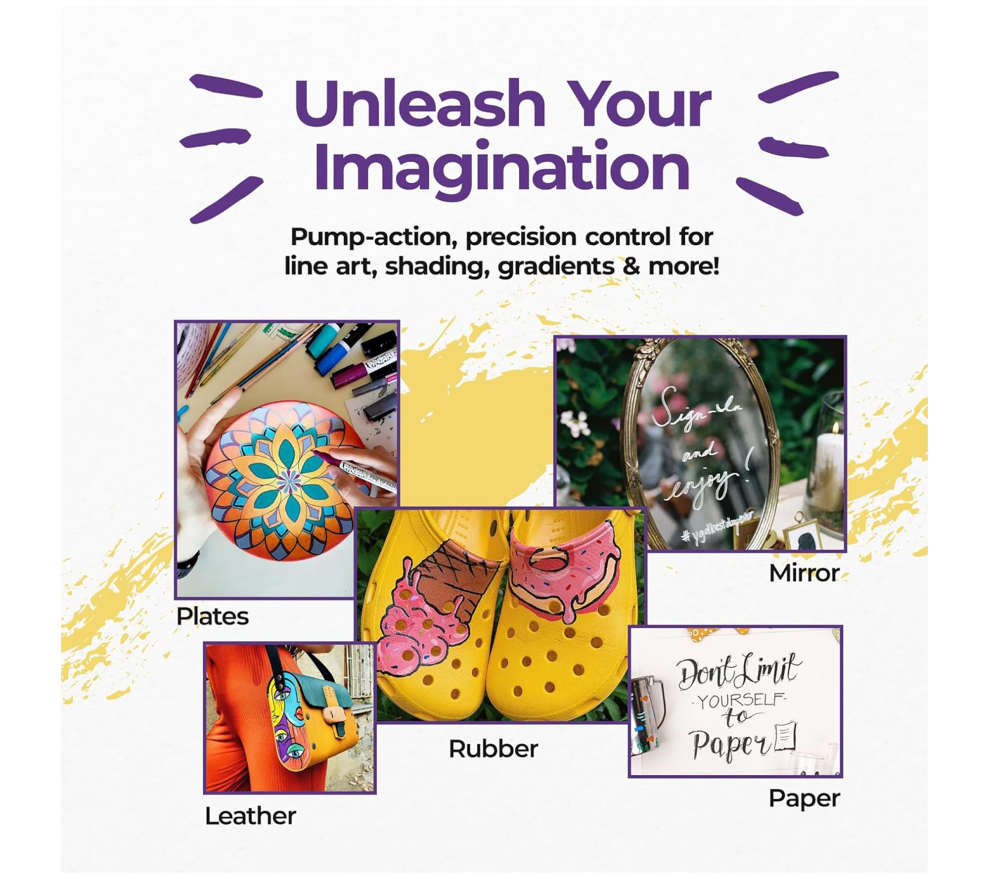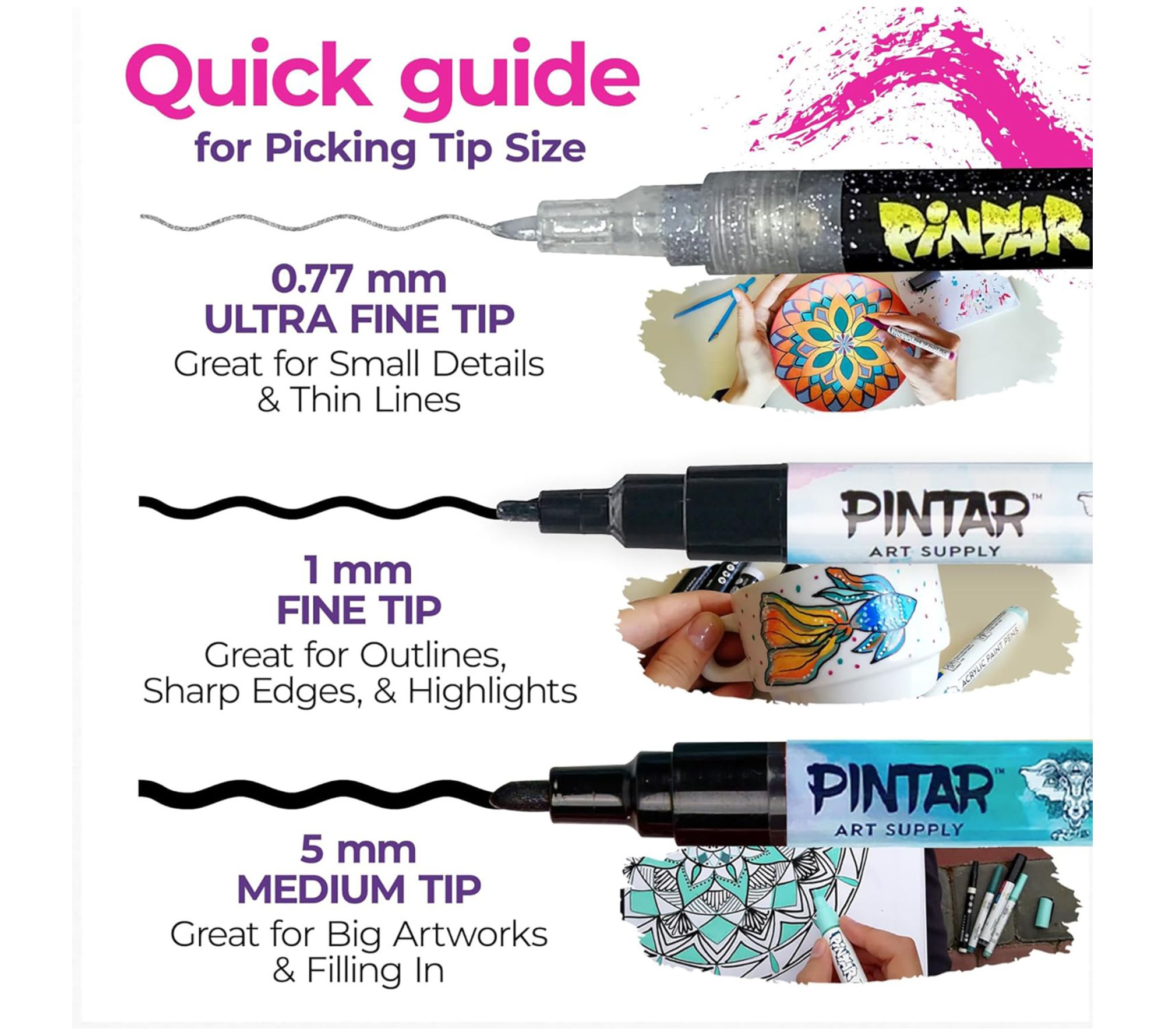 Unleash your creativity with Pintar glitter paint markers! These extra fine tip pens are perfect for adding a sparkle to any project, from rock painting to crafting gift cards. The vibrant colors work on a variety of surfaces including fabric, metal, and porcelain. Whether you're making posters or designing intricate mandalas, each stroke is illuminated by captivating glitter hues. From Pintar.