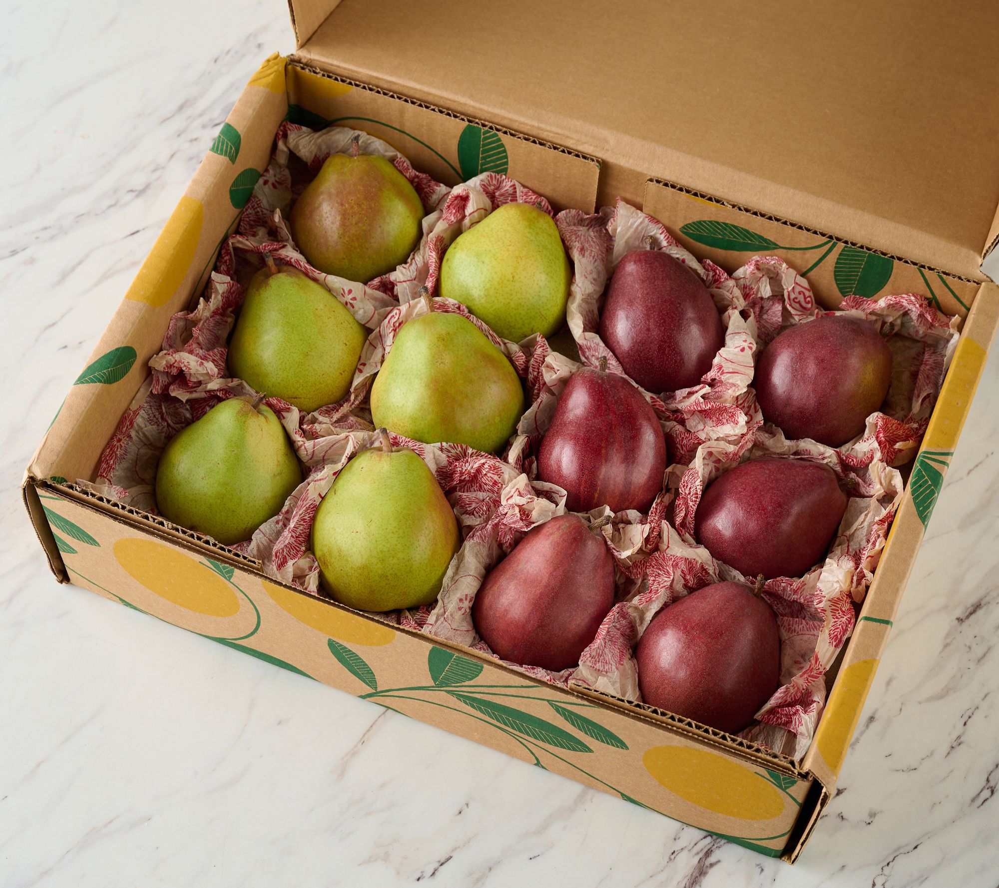 • Includes six 9-oz King Comice pears and six 7-oz Holiday Red pears