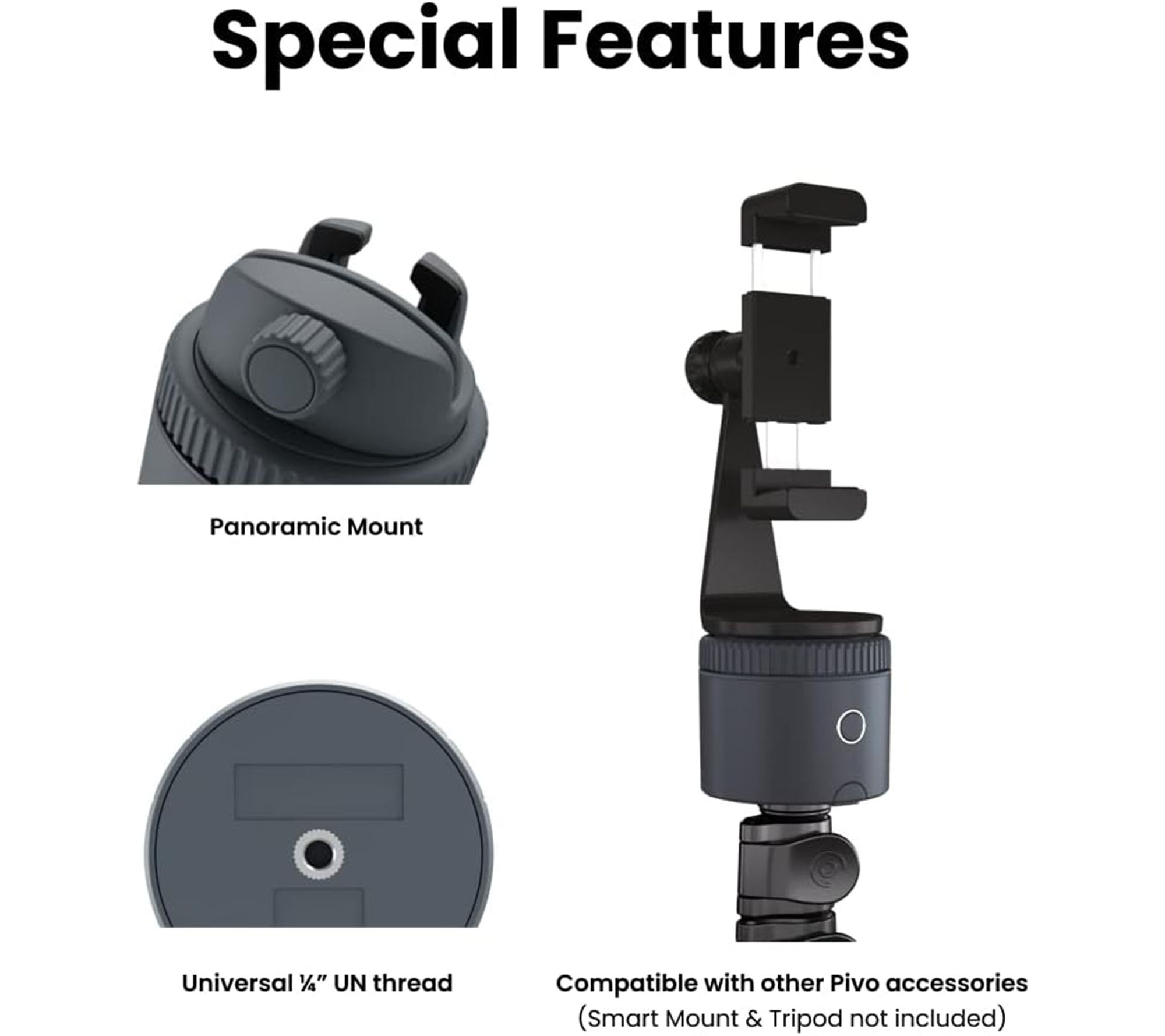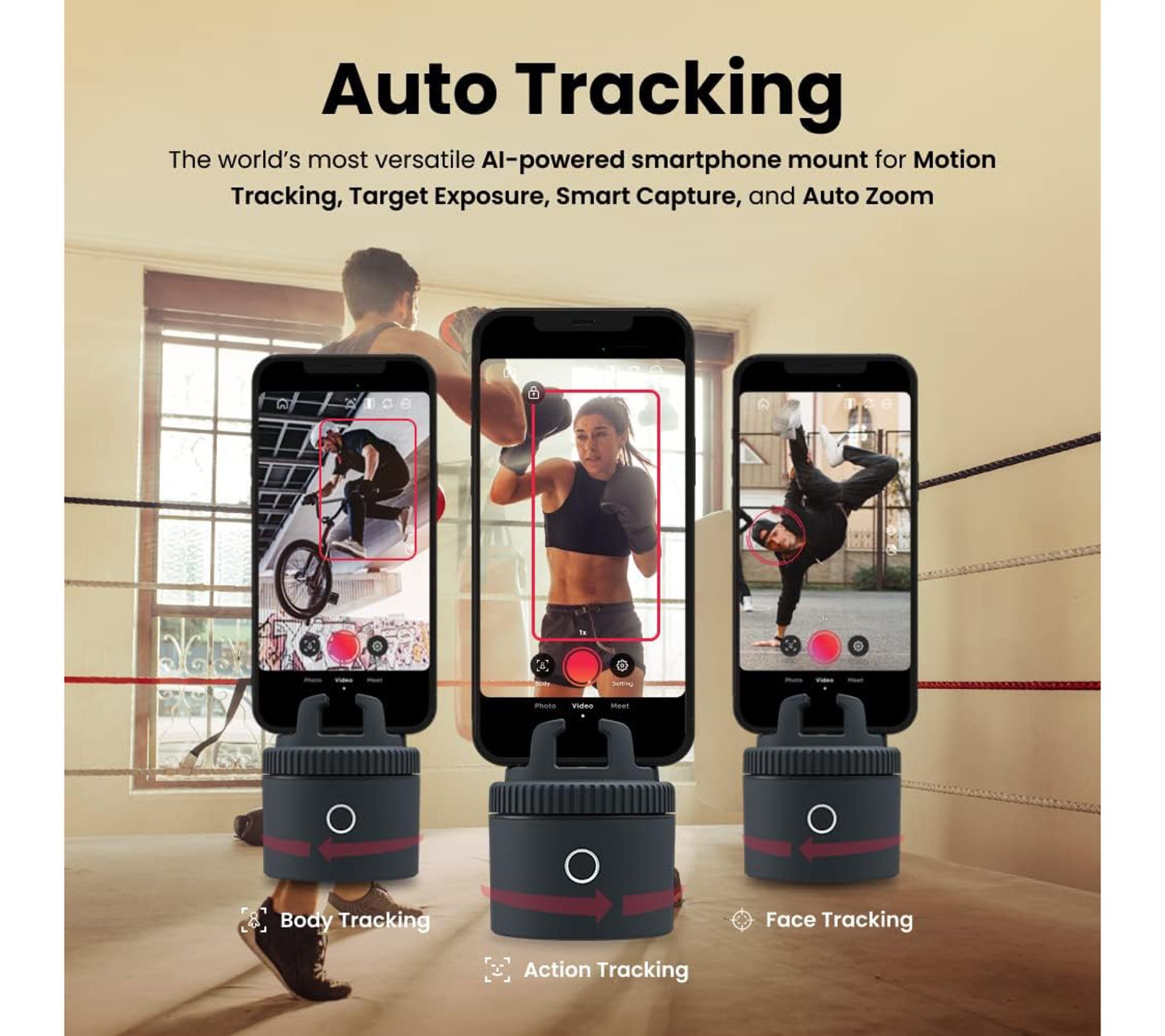 Elevate the quality of your mobile videos with the Pivo Pod Lite auto-tracking smartphone mount. Using 360-degree rotation and AI-powered face and body tracking, this innovative mount serves as your personal videographer, making it ideal for dance videos, fashion vlogs, and seamless video calls. From Pivo.