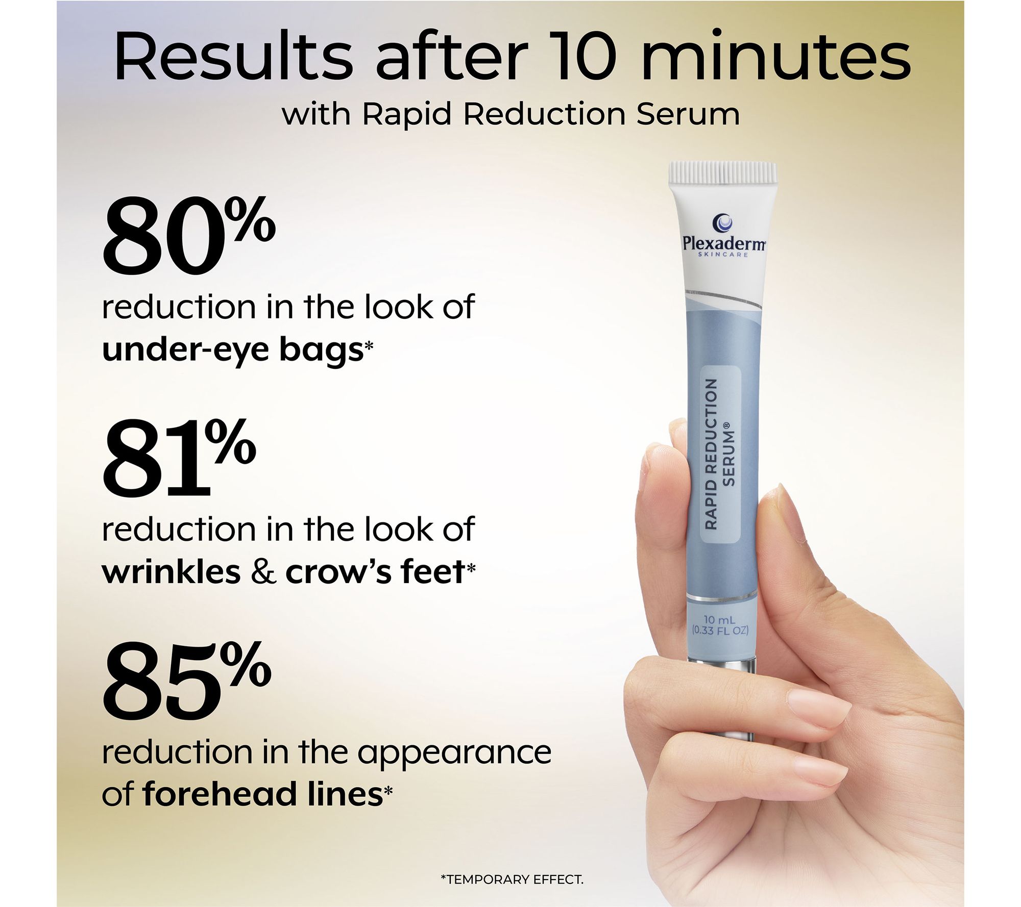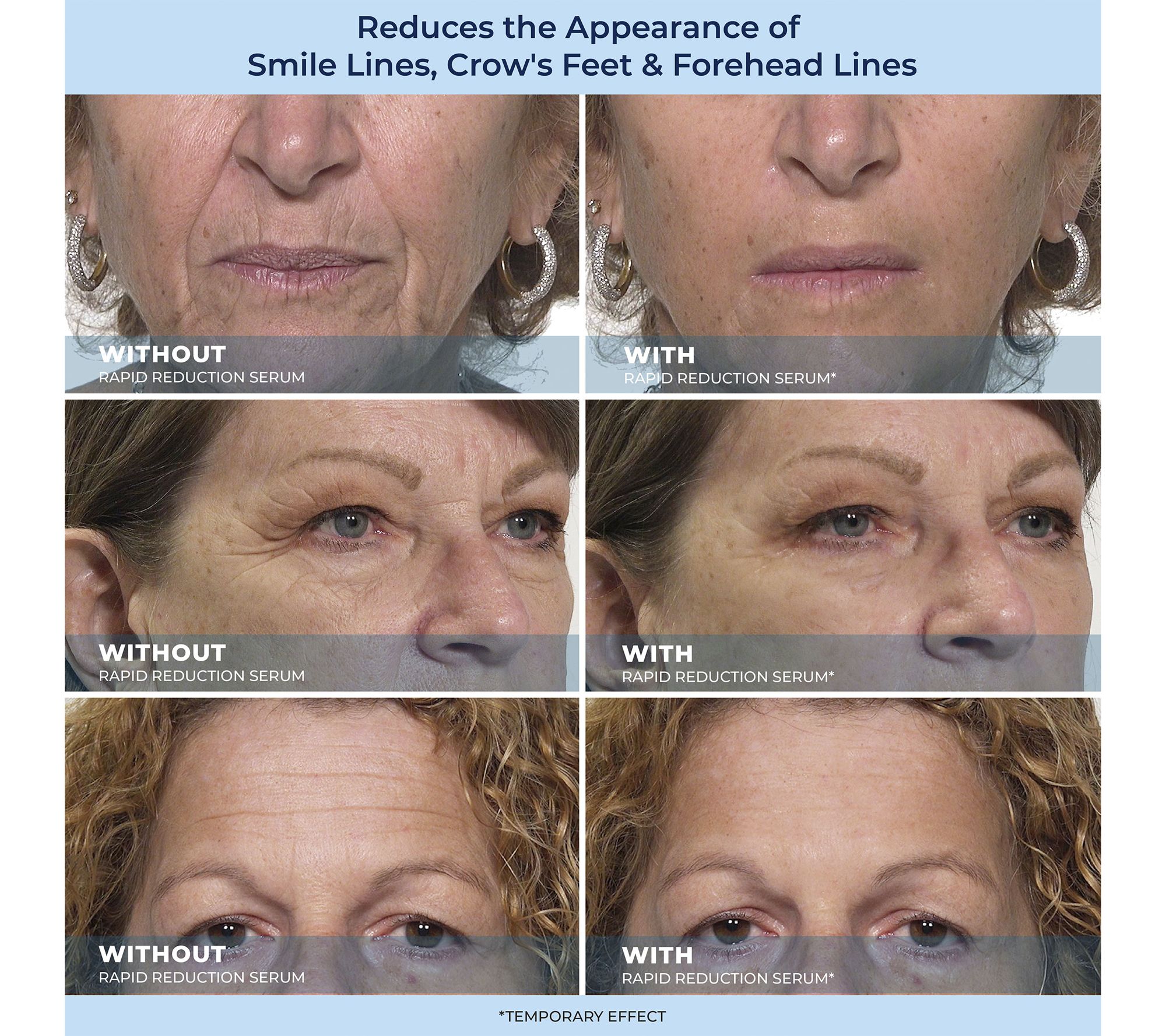 In a test with subjects using Rapid Reduction Serum just once, it temporarily reduced the appearance of wrinkles and crow's feet by an average of 81% after 10 minutes.