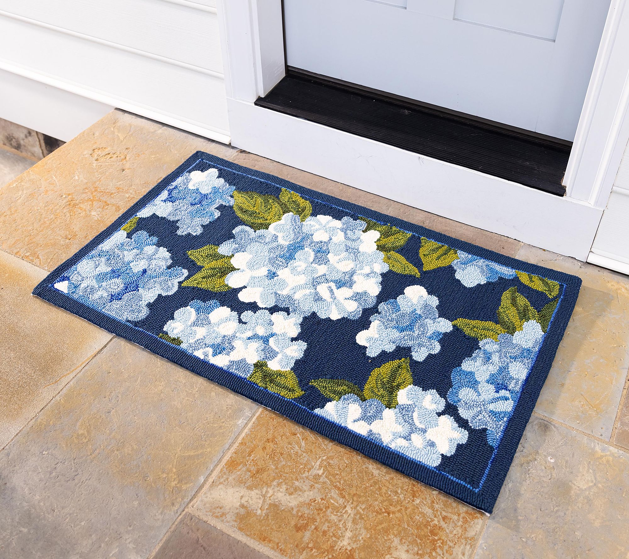 Bring a tranquil splash of blue and beautiful blooms to a patio, entryway, or porch with this durable accent rug that features an allover pattern of lush hydrangeas. From Plow & Hearth.