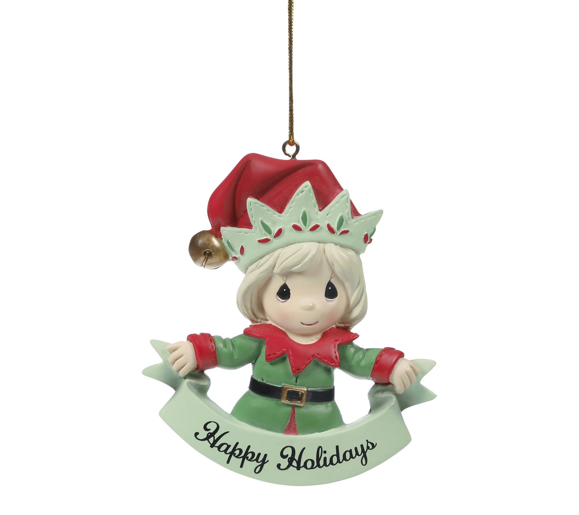 Spread a little joy this season with this charming elf ornament, featuring a cheerful helper in a classic costume and jingle bell-tipped hat. With a "Happy Holidays" banner in hand, she's ready to add a festive touch to your tree or gift packages. From PM.